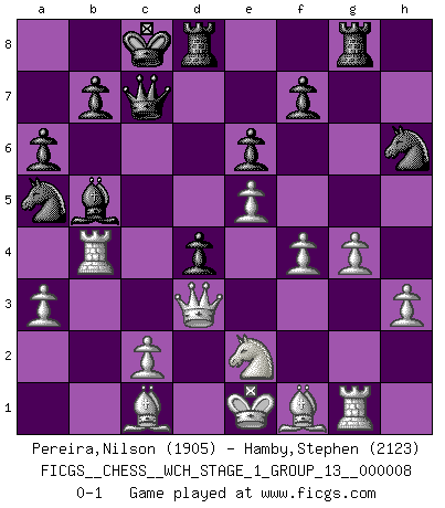 Last move : 0-1 2010 September 27 16:24:26 [Event "FICGS__CHESS__WCH_STAGE_1_GROUP_13__000008"] [Site "FICGS"] [Date "2010.07.02"] [Round "1"] [White "Pereira,Nilson"] [Black "Hamby,Stephen"] [Result "0-1"] [WhiteElo "1905"] [BlackElo "2123"] 1.e4 e6 2.d4 d5 3.Nc3 Bb4 4.e5 c5 5.a3 Bxc3+ 6.bxc3 Ne7 7.Qg4 Qc7 8.Qxg7 Rg8 9.Qxh7 cxd4 10.Ne2 Nbc6 11.f4 Bd7 12.Qd3 dxc3 13.Qxc3 Nf5 14.Rb1 O-O-O 15.Rg1 d4 16.Qd3 Na5 17.Rb4 a6 18.g4 Nh6 19.h3 Bb5 0-1 French : Winawer, Advance, poisoned pawn variation Queenside Castling by player Black (move 14) Player Black won this chess game. Follow this game move after move (download)Some part of a mistake is always correct. (Savielly Tartakover) Schon mancher Spieler hat aufgegeben, um zu vermeiden, daß er eine Figur verliert. (Savielly Grigorievitsch Tartakower) El Ajedrez es como la guerra en un tablero. (Bobby Fischer) 'L'échange des dames est un coup dur pour les deux adversaires...' Un journaliste lors d'une partie du match Spassky-Fischer Just because you do not take an interest in politics doesn't mean politics won't take an interest in you. (Pericles 430 B.C.)