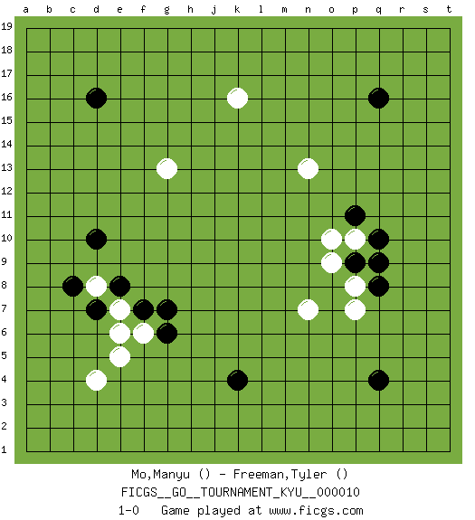 Last move : 1-0 2006 December 31 21:17:58 [Event "FICGS__GO__TOURNAMENT_KYU__000010"] [Site "FICGS"] [Date "2006.11.11"] [Round "1"] [Black "Mo,Manyu"] [White "Freeman,Tyler"] [Result "1-0"] 1.d16 k16 2.d10 g13 3.q4 n7 4.k4 d4 5.q16 n13 6.q10 o10 7.g7 f6 8.g6 e5 9.f7 e7 10.e8 d8 11.d7 e6 12.c8 p10 13.p9 p8 14.q8 o9 15.q9 p7 16.p11 1-0 This go game has been lost on time (started : 2006.11.11 14:23:0) Here are the names of the openings (joseki) played in the four corners : Corner d16 : d16 g13 Hoshi (Hwajeom, Seongjeom, Xingwei`) 4-4 Point. The star or hoshi (4-4) point, emphasizing influence at the potential expense of territory. Corner q4 : q4 n7 Hoshi (Hwajeom, Seongjeom, Xingwei`) 4-4 Point. The star or hoshi (4-4) point, emphasizing influence at the potential expense of territory. Corner q16 : q16 n13 Hoshi (Hwajeom, Seongjeom, Xingwei`) 4-4 Point. The star or hoshi (4-4) point, emphasizing influence at the potential expense of territory. Corner d4 : d4 g7 Hoshi (Hwajeom, Seongjeom, Xingwei`) 4-4 Point. The star or hoshi (4-4) point, emphasizing influence at the potential expense of territory. Player Black won this Go (weiqi, baduk) game. Follow this game move after move (download)Ikken tobi is never wrong. (Anonymous) There are two kinds of people in the world, my friend. Those who have a loaded gun and those who dig. You dig ! (Blondie in The Good, The Bad and The Ugly)