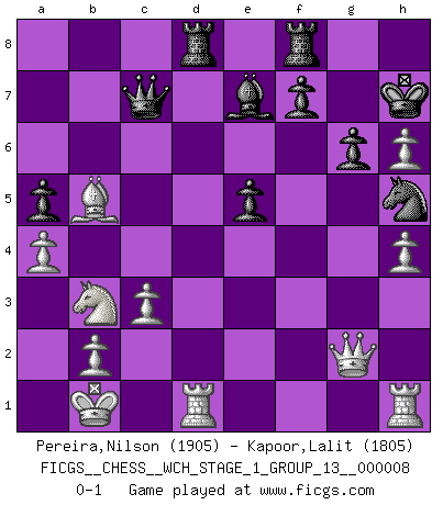 Last move : 0-1 2010 September 8 11:27:33 [Event "FICGS__CHESS__WCH_STAGE_1_GROUP_13__000008"] [Site "FICGS"] [Date "2010.07.02"] [Round "1"] [White "Pereira,Nilson"] [Black "Kapoor,Lalit"] [Result "0-1"] [WhiteElo "1905"] [BlackElo "1805"] 1.e4 c5 2.Nf3 d6 3.d4 cxd4 4.Nxd4 Nf6 5.Nc3 a6 6.Be3 e5 7.Nb3 Be6 8.f3 Nbd7 9.Qd2 Be7 10.g4 b5 11.O-O-O b4 12.Nd5 Bxd5 13.exd5 Nb6 14.Qxb4 Nfxd5 15.Bxb6 Nxb6 16.f4 Qc7 17.fxe5 dxe5 18.Qe4 O-O 19.Kb1 g6 20.c3 a5 21.a4 Nd7 22.Bb5 Nf6 23.Qg2 Rad8 24.g5 Nh5 25.h4 h6 26.gxh6 Kh7 0-1 This chess game has been lost on time (started : 2010.07.02 0:53:56) Sicilian : Najdorf, Byrne (English) attack Queenside Castling by player White (move 11) Kingside Castling by player Black (move 18) Player Black won this chess game. Follow this game move after move (download)The passion for playing Chess is one of the most unaccountable in the world. (H.G. Wells) Kostenjuk hat keinen Sexappeal. (Loek van Wely) El Ajedrez es realmente noventa y nueve por ciento calculación. (Soltis) On peut tirer plus d'utilité d'une partie perdue que de 100 parties gagnées. (Capablanca) I have opinions of my own - strong opinions - but I don't always agree with them. (George Bush)