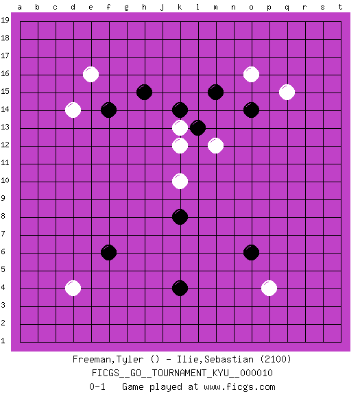 Last move : 0-1 2006 December 28 14:41:44 [Event "FICGS__GO__TOURNAMENT_KYU__000010 "] [Site "FICGS"] [Date "2006.11.11"] [Round "1"] [Black "Freeman,Tyler "] [White "Ilie,Sebastian "] [Result "0-1"] [Rating 2 "2100"] 1.k4 d4 2.f6 p4 3.o6 q15 4.o14 o16 5.m15 e16 6.f14 d14 7.h15 k10 8.k8 k13 9.k14 m12 10.l13 k12 0-1 This go game has been lost on time (started : 2006.11.11 14:23:0) Here are the names of the openings (joseki) played in the four corners : Corner d4 : d4 f6Hoshi (Hwajeom, Seongjeom, Xingwei`) 4-4 Point. The star or hoshi (4-4) point, emphasizing influence at the potential expense of territory. Corner q4 : p4 o6Takamoku (Gomok, Gaomu`) 5-4 Point. The takamoku (high) point (5-4). With its emphasis on influence, the 5-4 point complements the 4-4 (hoshi) point in creating an influence-oriented fuseki. Corner q16 : q15 o14Takamoku (Gomok, Gaomu`) 5-4 Point. The takamoku (high) point (5-4). With its emphasis on influence, the 5-4 point complements the 4-4 (hoshi) point in creating an influence-oriented fuseki. Corner d16 : e16 f14Takamoku (Gomok, Gaomu`) 5-4 Point. The takamoku (high) point (5-4). With its emphasis on influence, the 5-4 point complements the 4-4 (hoshi) point in creating an influence-oriented fuseki. Player White won this Go (weiqi, baduk) game.Follow this game move after move (download ) There are players who don't accept exchange: they play many moves that perpetuate a previous state of the game. (Pierre Audouard) If everyone is thinking alike, then somebody isn't thinking. (US General George S. Patton)