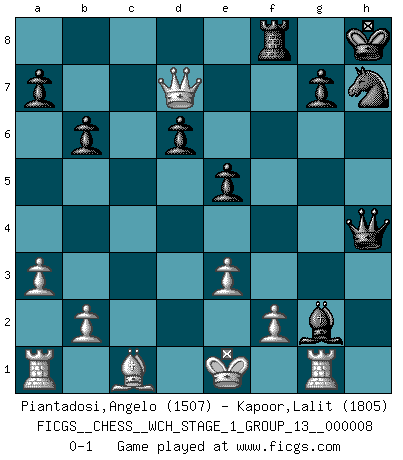 Last move : 0-1 2010 July 23 20:51:31 [Event "FICGS__CHESS__WCH_STAGE_1_GROUP_13__000008"] [Site "FICGS"] [Date "2010.07.02"] [Round "1"] [White "Piantadosi,Angelo"] [Black "Kapoor,Lalit"] [Result "0-1"] [WhiteElo "1507"] [BlackElo "1805"] 1.d4 Nf6 2.c4 e6 3.Nc3 Bb4 4.Qc2 O-O 5.a3 Bxc3+ 6.Qxc3 b6 7.Nf3 Bb7 8.e3 d6 9.Bd3 Nbd7 10.Qc2 e5 11.d5 c6 12.Ng5 cxd5 13.Bxh7+ Kh8 14.h4 dxc4 15.Qxc4 Nxh7 16.Nxf7+ Rxf7 17.Qxf7 Bxg2 18.Rg1 Qxh4 19.Qxd7 Rf8 0-1 Nimzo-Indian : Classical variation Kingside Castling by player Black (move 4) Player Black won this chess game. Follow this game move after move (download)If Chess is a science, it's a most inexact one. If Chess is an art, it is too exacting to be seen as one. If Chess is a sport, it's too esoteric. If Chess is a game, it's too demanding to be just a game. If Chess is a mistress, she's a demanding one. If Chess is a passion, it's a rewarding one. If Chess is life, it's a sad one. (Unknown) Auf Remis zu spielen ist gewissermaßen ein Verbrechen gegen das Schachspiel. (Mikhail Nekhemyevich Tal) a manera como él juega al Ajedrez, demuestra la completa naturaleza de un hombre. (Stanley Ellin) La vie et les Echecs sont tous les deux une lutte constante. (Lasker) I think your argument is specious - I think your tie is ugly. (Gregory House to Dr. Foreman, House M.D.)