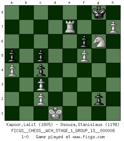 Last move : 1-0 2010 August 16 7:24:34 [Event "FICGS__CHESS__WCH_STAGE_1_GROUP_13__000008"] [Site "FICGS"] [Date "2010.07.02"] [Round "1"] [White "Kapoor,Lalit"] [Black "Dsouza,Stanislaus"] [Result "1-0"] [WhiteElo "1805"] [BlackElo "1198"] 1.e4 e5 2.Nf3 Nc6 3.Bb5 d6 4.d4 a6 5.Bxc6+ bxc6 6.dxe5 dxe5 7.Qxd8+ Kxd8 8.Nxe5 Bb7 9.Nxf7+ Ke8 10.Nxh8 c5 11.Nc3 Bd6 12.f4 c4 13.Be3 Bb4 14.O-O-O Bxc3 15.bxc3 Bxe4 16.Rhe1 Nf6 17.Bc5 Rd8 18.Bd4 c5 19.Bxf6 Rxd1+ 20.Kxd1 gxf6 21.Rxe4+ Kf8 22.f5 Kg7 23.Re8 a5 24.a4 h6 25.Ng6 Kf7 26.Re7+ Kg8 27.g4 h5 28.h4 hxg4 29.h5 g3 30.h6 g2 31.h7+ 1-0 Ruy Lopez : Old Steinitz defense Queenside Castling by player White (move 14) Player White won this chess game. Follow this game move after move (download)A thorough understanding of the typical mating continuations makes the most complicated sacrificial combinations leading up to them not only not difficult, but almost a matter of course. (Siegbert Tarrasch) Der Knackpunkt bei der Konzentration ist, daß wir nur durch sie etwas Neues und Ungewöhnliches am Schachbrett finden können. Sie ist der einzige Weg durch neue neue Ideen eine Überraschung zu bereiten. (Garry Kasparov) El Ajedrez moderno está demasiado preocupado con cosas como la estructura de Peones. Olvidenlo, el Jaque Mate termina la partida. (Nigel Short) Seul un grand joueur sait à quel point il joue faiblement. (Xavier Tartacover) No man has ever achieved immortality in his own life time. (Unknown)