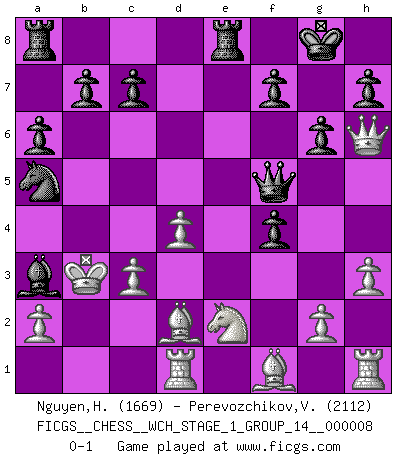 Last move : 0-1 2010 August 22 4:13:26 [Event "FICGS__CHESS__WCH_STAGE_1_GROUP_14__000008"] [Site "FICGS"] [Date "2010.07.02"] [Round "1"] [White "Nguyen,Hao Nhien"] [Black "Perevozchikov,Vjacheslav"] [Result "0-1"] [WhiteElo "1669"] [BlackElo "2112"] 1.e4 e5 2.Nc3 Nf6 3.f4 d5 4.d3 exf4 5.e5 d4 6.exf6 dxc3 7.bxc3 Qxf6 8.Ne2 Bd6 9.d4 O-O 10.Qd3 Re8 11.Bd2 Bg4 12.h3 Bf5 13.Qb5 Nc6 14.O-O-O a6 15.Qd5 Be4 16.Qh5 g6 17.Qh6 Ba3+ 18.Kb1 Bxc2+ 19.Kxc2 Qf5+ 20.Kb3 Na5+ 0-1 Comment by player 2 : Vjacheslav Perevozchikov : 19. Kxc2 Qf5+ 20. Kb3 Na5+ 21. Kxa3 Nc4+ 22. Kb3 Qb5+ 23. Kc2 Na3+ 24. Kc1 Qb1# 0-1 Vienna gambit, Steinitz variation Kingside Castling by player Black (move 9) Queenside Castling by player White (move 14) Player Black won this chess game. Follow this game move after move (download)You sit at the board and suddenly your heart leaps. Your hand trembles to pick up the piece and move it. But what Chess teaches you is that you must sit there calmly and think about whether it's really a good idea and whether there are other better ideas. (Stanley Kubrick) Schach ist ein schwarz-weisser Dschungel. (Garry Kasparov) Del Ajedrez se ha dicho que la vida no es lo suficientemente larga para él, pero eso es culpa de la vida, no del Ajedrez. (William Ewart Napier) Je ne suis pas le dernier à jouer lâchement des coups douteux pendant le zeïtnot de l'adversaire pour l'achever: en effet les coups qui font le plus peur sont ceux que l'on ne comprend pas. Je me fais souvent peur quand je joue. (Un professeur anonyme) Horse racing is animated roulette. (Roger Kahn)