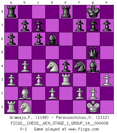 Last move : 0-1 2010 August 2 0:58:59 [Event "FICGS__CHESS__WCH_STAGE_1_GROUP_14__000008"] [Site "FICGS"] [Date "2010.07.02"] [Round "1"] [White "Gramajo,Francisco"] [Black "Perevozchikov,Vjacheslav"] [Result "0-1"] [WhiteElo "1148"] [BlackElo "2112"] 1.e4 e5 2.Nf3 Nc6 3.Bb5 a6 4.Bc4 Nf6 5.c3 Nxe4 6.Bd5 Nf6 7.Bxc6 dxc6 8.O-O e4 9.Re1 Be7 10.Nd4 O-O 11.h3 Bd6 12.b4 Re8 13.Bb2 Nd5 14.a3 Nf4 15.Re3 Qg5 16.Qg4 Bxg4 0-1 Ruy Lopez (Spanish Opening) Kingside Castling by player White (move 8) Kingside Castling by player Black (move 10) Player Black won this chess game. Follow this game move after move (download)In order to improve your game, you must study the endgame before everything else, for whereas the endings can be studied and mastered by themselves, the middle game and the opening must be studied in relation to the endgame. (Jose Raul Capablanca) Fischer: 'Remis!?' Uhlmann: 'Aber es muss doch dreimal Zugwiederholung sein!' Fischer: 'Sie nehmen das Remis an, wie ich es sage, sonst spiele ich weiter und werde Sie dann schlagen!' (Robert James Fischer) Solo existe una cosa que Fischer hace en el Ajedrez sin placer: ¡perder!. (Boris Spassky) Horreur, mais aussi harmonie suprême : qu'y avait-il en effet au monde en dehors des échecs ? Le brouillard, l'inconnu, le non-être... (Vladimir Nabokov) There is no vagueness without wind. (Chinese proverb)
