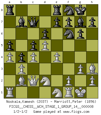 Last move : 1/2-1/2 2010 September 11 6:1:16 [Event "FICGS__CHESS__WCH_STAGE_1_GROUP_14__000008"] [Site "FICGS"] [Date "2010.07.02"] [Round "1"] [White "Nookala,Kamesh"] [Black "Marriott,Peter"] [Result "1/2-1/2"] [WhiteElo "2037"] [BlackElo "1896"] 1.d4 Nf6 2.g3 c5 3.d5 b5 4.Bg2 d6 5.Nf3 Nbd7 6.O-O Bb7 7.a4 b4 8.c4 g6 9.b3 Bg7 10.Bb2 a5 11.Nbd2 O-O 12.Qc2 Qc7 13.e4 Rfe8 14.Bh3 Nf8 15.Ne1 1/2-1/2 Queen's pawn game Kingside Castling by player White (move 6) Kingside Castling by player Black (move 11) This chess game ended in a draw. Follow this game move after move (download)The passed pawn is a criminal, who should be kept under lock and key. Mild measures, such as police surveillance, are not sufficient. (Nimzovitch) Smyslow ist ein Beweis dafür, dass ich noch zehn Jahre spielen kann! [der 75 jährige über den 85 jährigen] (Viktor Kortschnoi) Fischer sacrificó virtualmente todo lo que la mayoría de nosotros los 'debiles' (término que él usa) valoramos, respetamos y apreciamos por el amor de un astuto, a menudo hermoso tablero de juego, por el privilegio ambivalente de ser su mas grande maestro. (Paul Kollar) Fischer est le meilleur joueur du monde et Karpov n'est qu'un joueur de bistrot. (Garry Kasparov, agé de 16 ans) There is a great deal of difference between an eager man who wants to read a book and a tired man who wants a book to read. (G.K. Chesterton)