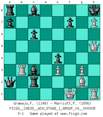 Last move : 0-1 2010 September 2 0:50:29 [Event "FICGS__CHESS__WCH_STAGE_1_GROUP_14__000008"] [Site "FICGS"] [Date "2010.07.02"] [Round "1"] [White "Gramajo,Francisco"] [Black "Marriott,Peter"] [Result "0-1"] [WhiteElo "1148"] [BlackElo "1896"] 1.Nf3 Nf6 2.g3 g6 3.Bg2 Bg7 4.d4 d5 5.Bg5 c5 6.Nbd2 cxd4 7.Nxd4 Qb6 8.N2b3 e5 9.Bxf6 Bxf6 10.Nf3 e4 11.Nfd4 Nc6 12.Nxc6 bxc6 13.e3 Bxb2 14.Rb1 Bc3+ 15.Nd2 Qa5 16.Rb3 O-O 17.h4 Rd8 18.h5 d4 19.hxg6 dxe3 20.gxh7+ Kh8 21.fxe3 Rxd2 22.Qh5 Rxc2 23.Kf1 Qxa2 0-1 Reti : King's Indian attack Kingside Castling by player Black (move 16) Player Black won this chess game. Follow this game move after move (download)Chess, like love, like music, has the power to make people happy. (Siegbert Tarrasch) Im Schach gewinnt jeder. Hat man Freunde am Spiel - und das ist die Hauptsache - ist auch der Verlust einer Partie kein Unglück. (David Bronstein) En manos de Fischer's, una diminuta ventaja teórica es tan buena como tener una Reina de ventaja. (Isaac Kashdan) Karpov est une pièce de musée. (Garry Kasparov) Bobby never cared about money, though. His only desire was to prove that his choices were correct: He wanted chess to be important because he was a chess player, and he wanted to be important. Bobby knew money was important, but he didn't have a clue why, outside of clothes and status. The only way he could accomplish what he wanted was to fight for a lot of money. Once he got it, he gave it away. He did not know how to spend it. And once he'd become champion, after, essentially, sacrificing his life for it, he didn't know how to spend his time. (Bob Wade)