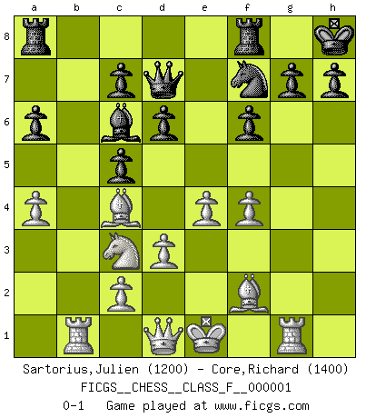 Last move : 0-1 2006 August 10 5:10:18 [Event "FICGS__CHESS__CLASS_F__000001"] [Site "FICGS"] [Date "2006.04.28"] [Round "1"] [White "Sartorius,Julien"] [Black "Core,Richard"] [Result "0-1"] [WhiteElo "1200"] [BlackElo "1400"] 1.e4 b6 2.Nf3 Bb7 3.Nc3 Nc6 4.Bc4 e5 5.d3 Bc5 6.Bg5 f6 7.Be3 Nge7 8.a3 d6 9.b4 Nd4 10.h3 Nxf3+ 11.gxf3 Qd7 12.bxc5 bxc5 13.Rb1 Bc6 14.f4 Ng6 15.fxe5 Nxe5 16.f4 Nf7 17.Rg1 Qxh3 18.Bf2 O-O 19.Nb5 Qd7 20.a4 a6 21.Nc3 Kh8 0-1 Owen defense Kingside Castling by player Black (move 18) Player Black won this chess game. Follow this game move after move (download)Many have become Chess Masters, no one has become the Master of Chess. (Siegbert Tarrasch) Die Idee von Capablanca, Schach als Fach in den Schulen zu lehren, ist großartig. (Fidel Castro) Sin errores no puede haber brillantez. (Emanuel Lasker) Le temps de noter son nom sur la feuille de partie, j'étais déjà en zeitnot ! D'un modeste amateur apparié lors de la première ronde d'un open contre le grand-maître Azmaïparashvili. I don't diet. I just don't eat as much as I'd like to. (Linda Evangelista, supermodel)