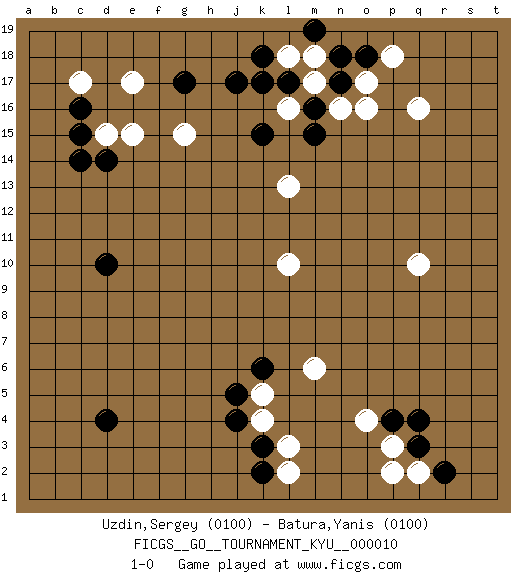 Last move : 1-0 2007 January 29 7:45:54 [Event "FICGS__GO__TOURNAMENT_KYU__000010"] [Site "FICGS"] [Date "2006.11.11"] [Round "1"] [Black "Uzdin,Sergey"] [White "Batura,Yanis"] [Result "1-0"] [Rating 1 "0100"] [Rating 2 "0100"] 1.q4 q16 2.d4 e17 3.c16 k4 4.d10 q10 5.g17 e15 6.d14 d15 7.c15 g15 8.j17 m17 9.k15 c17 10.c14 p3 11.q3 q2 12.r2 p2 13.p4 o4 14.k6 m6 15.j4 k5 16.k3 l3 17.k2 l2 18.j5 l10 19.m15 l13 20.n17 n16 21.m16 o17 22.n18 m18 23.o18 o16 24.l17 l18 25.k18 l16 26.k17 p18 27.m19 1-0 This go game has been lost on time (started : 2006.11.11 14:23:0) Here are the names of the openings (joseki) played in the four corners : Corner d16 : e17 c16 Mokuhazushi (Waemok, Wai`mu`) 5-3 Point. The mokuhazushi (5-3) point was popular in the Edo period in Japan (1600 - 1867). It emphasizes influence; territorially, it is inferior to the 3-4 point. Komoku Kakari. Black 2 is the standard approach because of its solidity and stability. Corner q4 : q4 p3 Hoshi (Hwajeom, Seongjeom, Xingwei`) 4-4 Point. The star or hoshi (4-4) point, emphasizing influence at the potential expense of territory. Player Black won this Go (weiqi, baduk) game. Follow this game move after move (download)Stop on second, extend on third. (Anonymous) If we knew what we were doing, we would not call it research. (Albert Einstein)