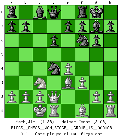 Last move : 0-1 2010 September 20 21:0:28 [Event "FICGS__CHESS__WCH_STAGE_1_GROUP_15__000008"] [Site "FICGS"] [Date "2010.07.02"] [Round "1"] [White "Mach,Jiri"] [Black "Helmer,Janos"] [Result "0-1"] [WhiteElo "1128"] [BlackElo "2108"] 1.e4 c5 2.Nf3 Nc6 3.d4 cxd4 4.Nxd4 d6 5.Nc3 g6 6.Be3 Bg7 7.Qd2 Nf6 8.f3 O-O 9.O-O-O Nxd4 0-1 This chess game has been lost on time (started : 2010.07.02 1:1:34) Sicilian defense Kingside Castling by player Black (move 8) Queenside Castling by player White (move 9) Player Black won this chess game. Follow this game move after move (download)By playing at Chess then, we may learn: First: Foresight... Second: Circumspection... Third: Caution... And lastly, we learn by Chess the habit of not being discouraged by present bad appearances in the state of our affairs, the habit of hoping for a favorable chance, and that of persevering in the secrets of resources. (Benjamin Franklin) Ich hatte Zahnschmerzen im ersten Spiel. In der zweiten Partie tat mir der Kopf weh. In der dritten war es eine Rheuma-Attacke und während der vierten fühlte ich mich nicht gut. Und in der fünften? Nun, man muss doch nicht jedes Spiel gewinnen, oder? (Savielly Grigorievitsch Tartakower) Las combinaciones han sido siempre el aspecto más intrigante del Ajedrez. Los Maestros las buscan, el público las aplauden, los críticos las alaban. La razón se debe a que las combinaciones hacen posible que el Ajedrez sea más que un ejercicio matemático con una carencia de vida. Ellas son la poesía del juego, son del Ajedrez lo que la melodía es de la música. Ellas representan el triunfo de la mente sobre la materia. (Reuben Fine) Fischer est le meilleur joueur du monde et Karpov n'est qu'un joueur de bistrot. (Garry Kasparov, agé de 16 ans) There will be no order, only chaos. (Sol Robeson in Pi by Darren Aronofsky)
