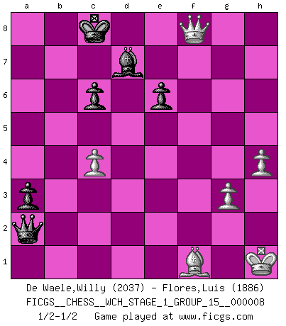 Last move : 1/2-1/2 2010 September 8 22:4:22 [Event "FICGS__CHESS__WCH_STAGE_1_GROUP_15__000008"] [Site "FICGS"] [Date "2010.07.02"] [Round "1"] [White "De Waele,Willy"] [Black "Flores,Luis"] [Result "1/2-1/2"] [WhiteElo "2037"] [BlackElo "1886"] 1.e4 c5 2.Nf3 d6 3.d4 cxd4 4.Nxd4 Nf6 5.Nc3 a6 6.Bg5 e6 7.f4 Qb6 8.Qd2 Qxb2 9.Rb1 Qa3 10.f5 Nc6 11.fxe6 fxe6 12.Nxc6 bxc6 13.e5 dxe5 14.Bxf6 gxf6 15.Ne4 Be7 16.Be2 h5 17.Rb3 Qa4 18.Nxf6+ Bxf6 19.c4 Bh4+ 20.g3 Be7 21.O-O Ra7 22.Rb8 Rc7 23.Qd3 Bc5+ 24.Kh1 Ke7 25.Qe4 Rd7 26.Qxe5 Bd4 27.Qg5+ Kd6 28.Rd1 Kc7 29.Rxd4 Kxb8 30.Rxd7 Bxd7 31.Qe5+ Kb7 32.Qb2+ Kc7 33.Qxh8 Qxa2 34.Qxh5 a5 35.Qe5+ Kb7 36.h4 a4 37.Qd4 Be8 38.Bf1 a3 39.Qg7+ Kc8 40.Qe7 Bd7 41.Qf8+ Kb7 42.Qd6 Kc8 43.Qf8+ Kb7 44.Qd6 Kc8 45.Qf8+ 1/2-1/2 Sicilian : Najdorf, 7...Qb6 Kingside Castling by player White (move 21) This chess game ended in a draw. Follow this game move after move (download)War is the child of passion, passion is the child of narcissism and narcissism is the child. (...) Another game ? (Thibault de Vassal) Ich erzeugte keinen Neid, da mich die Schachspieler als Musiker und die Musiker als Schachspieler betrachteten. (Mark Taimanov) Yo siempre he tenido un ligero sentimiento de lástima por una persona que no tiene conocimiento del Ajedrez. (Siegbert Tarrasch) J'apprécie les joueurs d'est-indienne, c'est grâce à eux que je nourris ma famille depuis tant d'années. (Petrosian) Two beer, or not two beer. (Unknown)