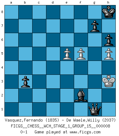Last move : 0-1 2010 October 25 21:28:48 [Event "FICGS__CHESS__WCH_STAGE_1_GROUP_15__000008"] [Site "FICGS"] [Date "2010.07.02"] [Round "1"] [White "Vasquez,Fernando"] [Black "De Waele,Willy"] [Result "0-1"] [WhiteElo "1835"] [BlackElo "2037"] 1.e4 c5 2.d4 cxd4 3.c3 Nf6 4.e5 Nd5 5.Nf3 Nc6 6.Bc4 e6 7.cxd4 d6 8.Qe2 Be7 9.O-O O-O 10.Nc3 Nxc3 11.bxc3 dxe5 12.dxe5 Qa5 13.Bd2 Rd8 14.Rfd1 b6 15.a4 Bb7 16.Bb5 a6 17.Bd3 Rac8 18.Be4 h6 19.h3 Ba8 20.Rdb1 Bf8 21.h4 Rb8 22.h5 Rd7 23.Nd4 Rc8 24.Be1 Ra7 25.f4 Qc5 26.Bf2 Nxd4 27.cxd4 Qc7 28.f5 Bxe4 29.Qxe4 exf5 30.Qxf5 Re8 31.Ra2 Qd8 32.Rab2 Rb7 33.Be3 Re6 34.Qe4 Rbe7 35.Kh2 Re8 36.Rf2 Qd7 37.Qf5 b5 38.axb5 axb5 39.Qg4 Qd5 40.Qf3 Qd7 41.Rbf1 f6 42.Qg4 R6e7 43.Rf5 fxe5 44.dxe5 Rf7 45.Kh3 Rxf5 46.Rxf5 Qe6 47.Bd4 b4 48.Rf3 Qc4 49.Kg3 Qc6 50.Bb2 Qd5 51.Kh2 Bc5 52.Qg6 Qd7 53.Rf7 Qxf7 54.Kg3 Qf2+ 55.Kh3 Rd8 56.Qe4 Qxb2 57.Qc4+ Kh8 58.Qe4 b3 59.Kh2 Qd4 60.Qf5 Rf8 61.g4 Rxf5 62.gxf5 Qg1+ 63.Kh3 Bf2 0-1 Sicilian : Smith-Morra gambit Kingside Castling by player White (move 9) Kingside Castling by player Black (move 9) 10 pieces endgame at move 62 : White KPPP , Black KQBPPP WHITE : King + 3 Pawns BLACK : King + 1 Queen 1 Bishop 3 Pawns Player Black won this chess game. Follow this game move after move (download)Chess is everything: art, science and sport. (Anatoly Karpov) Im Leben werden Partien nie so unstrittig gewonnen wie im Spiel (Emanuel Lasker) Repentinamente, me resultaba obvio en mi analisis que yo había pasado por alto lo que Fischer había visto en el tablero con la mas grande facilidad. (Mikhail Botvinnik) Roi des jeux et jeu des rois, les échecs portent en eux un sentiment d'infini. Ils donnent à celui qui s'est efforcé d'en approfondir les arcanes l'impression de n'être pas à la mesure de l'homme; en fait, ils constituent un résumé de l'univers, un microcosme, et figurent cette grande échelle qui, dans les plans de la lumière descend jusqu'à la matière, qui des abîmes insondables remonte jusqu'en l'infini de Dieu. (Pyrame) Unless I accept my faults I will most certainly doubt my virtues. (Hugh Prather)