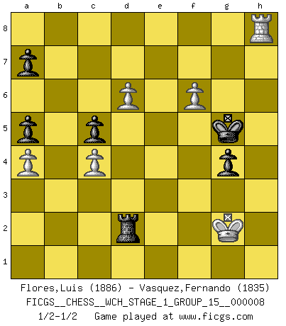 Last move : 1/2-1/2 2010 December 4 10:40:47 [Event "FICGS__CHESS__WCH_STAGE_1_GROUP_15__000008"] [Site "FICGS"] [Date "2010.07.02"] [Round "1"] [White "Flores,Luis"] [Black "Vasquez,Fernando"] [Result "1/2-1/2"] [WhiteElo "1886"] [BlackElo "1835"] 1.e4 e5 2.Nf3 Nf6 3.Nxe5 d6 4.Nf3 Nxe4 5.d4 d5 6.Bd3 Nc6 7.O-O Be7 8.c4 Nb4 9.Be2 O-O 10.Nc3 Bf5 11.a3 Nxc3 12.bxc3 Nc6 13.Re1 Re8 14.cxd5 Qxd5 15.Bf4 Bd6 16.c4 Qe4 17.Be3 Rad8 18.Ra2 h6 19.h3 Qe7 20.Bd3 Qd7 21.Bxf5 Qxf5 22.Qb3 b6 23.Rae2 Qd7 24.Qc3 Bf8 25.Rd2 Na5 26.Rd3 c5 27.d5 Qa4 28.Rc1 g6 29.Qc2 Qxc2 30.Rxc2 f5 31.g3 g5 32.Bd2 Nb7 33.Be3 Kf7 34.h4 g4 35.Nd2 h5 36.Kg2 Bg7 37.a4 Be5 38.Nf1 Kg6 39.Bg5 Bf6 40.Be3 Na5 41.Ra3 Bb2 42.Rd3 Bg7 43.Ra3 Bf6 44.Bd2 Re2 45.Ne3 f4 46.gxf4 Bxh4 47.Bxa5 Rxc2 48.Nxc2 bxa5 49.Ne3 Rb8 50.Ra2 Re8 51.Ra1 Re4 52.f5+ Kf6 53.Rh1 Bg5 54.Rxh5 Bxe3 55.fxe3 Rxe3 56.d6 Rd3 57.Rh8 Rd2+ 58.Kg3 Kg5 59.f6 Rd3+ 60.Kg2 Rd2+ 61.Kg3 Rd3+ 62.Kg2 Rd2+ 1/2-1/2 Petrov : Classical attack Kingside Castling by player White (move 7) Kingside Castling by player Black (move 9) This chess game ended in a draw. Follow this game move after move (download)It was clear to me that the vulnerable point of the American Grandmaster (Bobby Fischer) was in double-edged, hanging, irrational positions, where he often failed to find a win even in a won position. (Efim Geller) Ich trinke, ich rauche, ich spiele, ich liebe Frauen aber Fernschach ist ein Laster, das ich nicht habe. (Mikhail Nekhemyevich Tal) Cuando tengas duda... ¡juega al Ajedrez!. (Tevis) D'abord les bases : Jouez et étudiez, puis étudiez et jouez, ensuite jouez et étudiez, puis étudiez et jouez. Deuxièmement : Donnez toujours le meilleur de vous-même ! (Ken Smith) Internal peace cannot coexist with external war. (Don Groves)