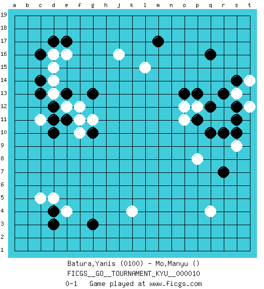 Last move : 0-1 2007 January 23 18:57:52 [Event "FICGS__GO__TOURNAMENT_KYU__000010 "] [Site "FICGS"] [Date "2006.11.11"] [Round "1"] [Black "Batura,Yanis "] [White "Mo,Manyu "] [Result "0-1"] [Rating 1 "0100"] 1.d3 q4 2.q16 d15 3.e17 c5 4.q10 k4 5.g3 j16 6.m17 l15 7.c16 e4 8.d4 d5 9.d10 d16 10.d17 e16 11.c13 d13 12.c14 d14 13.d12 e12 14.r7 p8 15.p13 r12 16.r13 s13 17.s14 t12 18.s11 r11 19.r10 s9 20.s10 q11 21.p11 p12 22.s12 t14 23.q12 o12 24.o13 o11 25.g10 f11 26.g13 g11 27.e11 c11 28.e13 f12 29.d11 f10 0-1 This go game has been lost on time (started : 2006.11.11 14:23:0) Here are the names of the openings (joseki) played in the four corners : Corner d16 : d15 e17Takamoku (Gomok, Gaomu`) 5-4 Point. The takamoku (high) point (5-4). With its emphasis on influence, the 5-4 point complements the 4-4 (hoshi) point in creating an influence-oriented fuseki. Corner d4 : d3 c5Komoku (Somok, Xiao~mu`) 3-4 Point. The komoku (3-4) point is the traditional corner enclosure move..Ikken Kakari (Hankan Keolch'im, Yi Gua`jiao~, 1-Space Low Pincer). The small knight move is the basic approach move to the 3-4 point stone. It has been continually used for over four centuries. There are limitless variations, with new moves constantly being discovered. White 2 opens the door to a treaure store of joseki. Corner q4 : q4 r7Hoshi (Hwajeom, Seongjeom, Xingwei`) 4-4 Point. The star or hoshi (4-4) point, emphasizing influence at the potential expense of territory.Nikken Kakari (Dukan Keolch'im, E`r Gua`jiao~, 2-Space Low Approach). White typically answers by 7-3 or 3-5 (which is not joseki). Player White won this Go (weiqi, baduk) game.Follow this game move after move (download ) Knight's moves win running battles. (Anonymous) God is an atheist. (Unknown)