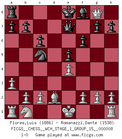 Last move : 1-0 2010 September 4 11:7:39 [Event "FICGS__CHESS__WCH_STAGE_1_GROUP_15__000008"] [Site "FICGS"] [Date "2010.07.02"] [Round "1"] [White "Flores,Luis"] [Black "Romanazzi,Dante"] [Result "1-0"] [WhiteElo "1886"] [BlackElo "1538"] 1.e4 e5 2.Nf3 d6 3.d4 Bg4 4.dxe5 Bxf3 5.Qxf3 dxe5 6.Bc4 Qe7 7.Bg5 f6 8.Bd2 c6 9.a3 Nd7 10.Bxg8 Rxg8 11.Qb3 Nc5 12.Qxg8 1-0 This chess game has been lost on time (started : 2010.07.02 1:1:34) Philidor's defense Player White won this chess game. Follow this game move after move (download)A chess genius has died; a loss for humanity. (Viktor Kortchnoi, about Bobby Fischer's death) In Buenos Aires ist es nicht mein vorrangiges Ziel ein starkes Turnier zu organisieren, sondern ein Turnier für Gentlemen. Ich würde nie Kamsky einladen. Ich mag keine Probleme. (Miguel Najdorf) No nos podemos resistir a la fascinación de un sacrificio ya que la pasión por los sacrificios es parte de la naturaleza de un jugador de Ajedrez. (Rudolf Spielman) Karpov est une pièce de musée. (Garry Kasparov) The Movers & Shakers of this world are those who play chess in the mornings and go to the disco in the evenings. (Dinesh De Silva)