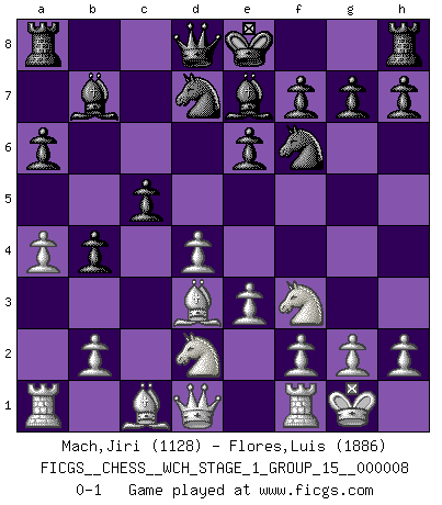 Last move : 0-1 2010 September 12 8:40:49 [Event "FICGS__CHESS__WCH_STAGE_1_GROUP_15__000008"] [Site "FICGS"] [Date "2010.07.02"] [Round "1"] [White "Mach,Jiri"] [Black "Flores,Luis"] [Result "0-1"] [WhiteElo "1128"] [BlackElo "1886"] 1.d4 Nf6 2.c4 d5 3.Nf3 e6 4.Nc3 c6 5.e3 Nbd7 6.Bd3 dxc4 7.Bxc4 b5 8.Bd3 a6 9.a4 Bb7 10.O-O b4 11.Ne4 c5 12.Ned2 Be7 0-1 This chess game has been lost on time (started : 2010.07.02 1:1:34) Queen's pawn game Kingside Castling by player White (move 10) Player Black won this chess game. Follow this game move after move (download)There is no remorse like the remorse of Chess. (H. G. Wells) Ich kämpfe solange mein Gegner einen Fehler machen kann. (Emanuel Lasker) Bobby Fischer es el jugador de Ajedrez mas grande que jamás haya existido. (Ken Smith) Il n'y a pas de prix trop élevé au scalp de l'ennemi. (Koblentz) All art requires courage. (Anne Tucker)