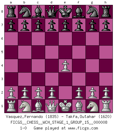 Last move : 1-0 2010 September 13 20:47:46 [Event "FICGS__CHESS__WCH_STAGE_1_GROUP_15__000008"] [Site "FICGS"] [Date "2010.08.13"] [Round "1"] [White "Vasquez,Fernando"] [Black "Takfa,Outahar"] [Result "1-0"] [WhiteElo "1835"] [BlackElo "1620"] 1.e4 1-0 This chess game has been lost on time (started : 2010.08.13 14:20:5) King's pawn Opening Player White won this chess game. Follow this game move after move (download)Alekhine is a poet who creates a work of art out of something that would hardly inspire another man to send home a picture post card. (Max Euwe) Smyslow ist ein Beweis dafür, dass ich noch zehn Jahre spielen kann! [der 75 jährige über den 85 jährigen] (Viktor Kortschnoi) Un Peón pasado es un criminal, quién debe ser mantenido bajo candado y llave. Leves medidas, tales como vigilancia policiaca, no son suficientes. (Aaron Nimzovich) Les Echecs représentent une sphère d'idées créatrices basée sur la volonté des deux protagonistes. (Smyslov) History is a gallery of pictures in which there are few originals and many copies. (Alexis de Tocqueville)