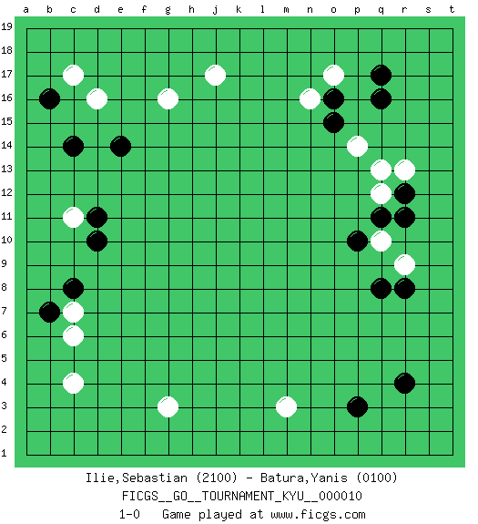Last move : 1-0 2007 January 18 12:37:27 [Event "FICGS__GO__TOURNAMENT_KYU__000010"] [Site "FICGS"] [Date "2006.11.11"] [Round "1"] [Black "Ilie,Sebastian"] [White "Batura,Yanis"] [Result "1-0"] [Rating 1 "2100"] [Rating 2 "0100"] 1.q16 d16 2.r4 c4 3.p3 j17 4.c8 q10 5.r8 r9 6.q8 g3 7.c14 m3 8.r12 o17 9.q17 q12 10.r11 r13 11.q11 q13 12.o16 n16 13.o15 p14 14.p10 c11 15.b16 c17 16.e14 g16 17.d10 c7 18.b7 c6 19.d11 1-0 This go game has been lost on time (started : 2006.11.11 14:23:0) Here are the names of the openings (joseki) played in the four corners : Corner d4 : c4 c8 Komoku (Somok, Xiao~mu`) 3-4 Point. The komoku (3-4) point is the traditional corner enclosure move.. Player Black won this Go (weiqi, baduk) game. Follow this game move after move (download)There is death in the hane. (Anonymous) If you ain't just a little scared when you enter a casino, you are either very rich or you haven't studied the games enough. (Pappy)
