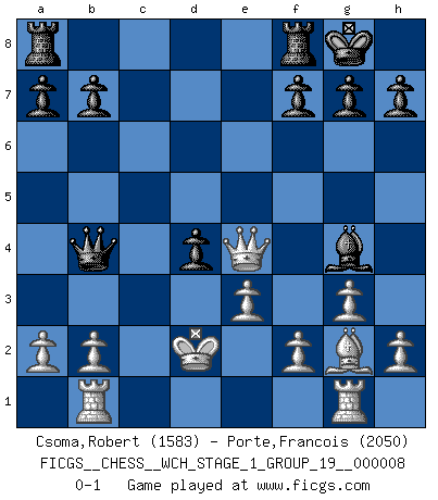 Last move : 0-1 2010 August 6 18:4:49 [Event "FICGS__CHESS__WCH_STAGE_1_GROUP_19__000008"] [Site "FICGS"] [Date "2010.07.02"] [Round "1"] [White "Csoma,Robert"] [Black "Porte,Francois"] [Result "0-1"] [WhiteElo "1583"] [BlackElo "2050"] 1.Nf3 c5 2.c4 Nc6 3.d4 cxd4 4.Nxd4 Nf6 5.Nc3 e6 6.g3 Qb6 7.Nxc6 Bc5 8.e3 Qxc6 9.Rg1 O-O 10.Bg2 d5 11.cxd5 exd5 12.Qf3 Qb6 13.Rb1 Bg4 14.Qf4 d4 15.Ne4 Bb4+ 16.Bd2 Nxe4 17.Qxe4 Bxd2+ 18.Kxd2 Qb4+ 0-1 Reti Opening Kingside Castling by player Black (move 9) Player Black won this chess game. Follow this game move after move (download)The mistakes are there, waiting to be made. (Savielly Tartakower) Kein Schachspieler kann gut schlafen. (H. G. Wells) Un buen sacrificio es aquel que aunque no sea necesariamente sólido, deja a tu oponente aturdido y confuso. (Rudolph Spielmann) J'ai toujours senti une vague pitié pour l'homme qui ne connaît rien aux échecs, tout comme j'en aurais pour un homme ignorant de l'amour. Les Echecs, comme la musique ou comme l'amour, ont le pouvoir de rendre heureux. (Siegbert Tarrasch) Winning isn't everything... but losing is nothing. (Mednis)