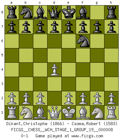 Last move : 0-1 2010 September 3 11:5:41 [Event "FICGS__CHESS__WCH_STAGE_1_GROUP_19__000008"] [Site "FICGS"] [Date "2010.07.02"] [Round "1"] [White "Dikant,Christophe"] [Black "Csoma,Robert"] [Result "0-1"] [WhiteElo "1866"] [BlackElo "1583"] 1.d4 Nf6 0-1 This chess game has been lost on time (started : 2010.07.02 1:9:13) Queen's pawn game Player Black won this chess game. Follow this game move after move (download)In order to improve your game, you must study the endgame before everything else, for whereas the endings can be studied and mastered by themselves, the middle game and the opening must be studied in relation to the endgame. (Jose Raul Capablanca) Zeige mir drei Eröffnungsvarianten und ich beweise dir, dass zwei davon inkorrekt sind. (Emanuel Lasker) Jugadores de primera clase pierden en contra de jugadores de segunda clase porque los jugadores de segunda clase a veces juegan una partida de primer clase. (Siegbert Tarrasch) Il n'y a plus de joueurs du niveau de Jacob Murray dont la seule quête est le beau jeu, le plaisir de voir les pièces construire quelque chose. Sur 10 idées à la minute, 9 seront sans intérêt, la dernière s'avèrera géniale. (Christian Bauer) No man has ever achieved immortality in his own life time. (Unknown)