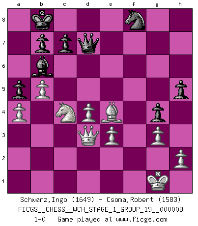 Last move : 1-0 2010 October 23 10:13:36 [Event "FICGS__CHESS__WCH_STAGE_1_GROUP_19__000008"] [Site "FICGS"] [Date "2010.07.02"] [Round "1"] [White "Schwarz,Ingo"] [Black "Csoma,Robert"] [Result "1-0"] [WhiteElo "1649"] [BlackElo "1583"] 1.g3 d5 2.Bg2 e5 3.f3 Nf6 4.Nh3 Bc5 5.Nf2 Nc6 6.O-O Be6 7.d3 h5 8.Bg5 Qd7 9.c3 Nh7 10.Bd2 g5 11.b4 Bb6 12.Qc1 g4 13.f4 exf4 14.Bxf4 Nf8 15.d4 Ng6 16.Nd3 Nxf4 17.Nxf4 O-O-O 18.a4 a5 19.b5 Ne7 20.Nxe6 fxe6 21.e3 Rdf8 22.Na3 Ng6 23.c4 Rxf1+ 24.Qxf1 Rf8 25.Qd3 Qf7 26.Rf1 Qe8 27.Rxf8 Nxf8 28.cxd5 exd5 29.Bxd5 Qd7 30.Be4 Kb8 31.Nc4 1-0 This chess game has been lost on time (started : 2010.07.02 1:9:13) Benko's Opening Kingside Castling by player White (move 6) Queenside Castling by player Black (move 17) Player White won this chess game. Follow this game move after move (download)Of all my Russian books, the defense contains and diffuses the greatest 'warmth' which may seem odd seeing how supremely abstract Chess is supposed to be. (Vladimir Nabokov) Schon mancher Spieler hat aufgegeben, um zu vermeiden, daß er eine Figur verliert. (Savielly Grigorievitsch Tartakower) El jugador táctico sabe que hacer cuando hay algo que hacer; mientras que el estratega sabe que hacer cuando no hay nada que hacer. (Gerald Abrahams) Les erreurs sont comme les malheurs, elles n'arrivent jamais seules. (Siegbert Tarrasch) To err is human, but to really foul things up requires a computer. (Farmer's Almanac, 1978)