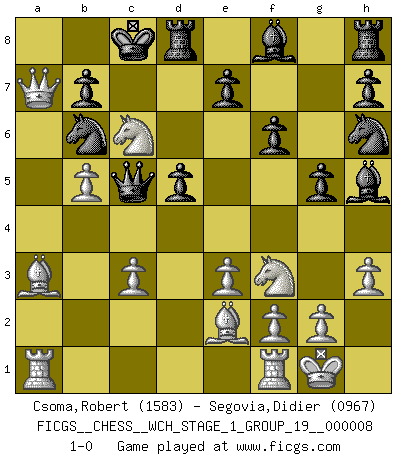Last move : 1-0 2010 August 10 4:56:17 [Event "FICGS__CHESS__WCH_STAGE_1_GROUP_19__000008"] [Site "FICGS"] [Date "2010.07.02"] [Round "1"] [White "Csoma,Robert"] [Black "Segovia,Didier"] [Result "1-0"] [WhiteElo "1583"] [BlackElo "0967"] 1.Nf3 d5 2.d4 f6 3.Nc3 Nc6 4.e3 Bg4 5.Be2 Qd6 6.h3 Bh5 7.O-O O-O-O 8.a4 a6 9.Na2 Nh6 10.c3 Na5 11.b4 Nc4 12.b5 axb5 13.axb5 g5 14.Nb4 Kb8 15.Qa4 Nb6 16.Qa7+ Kc8 17.Ba3 c5 18.dxc5 Qxc5 19.Nc6 1-0 Reti Opening Kingside Castling by player White (move 7) Queenside Castling by player Black (move 7) Player White won this chess game. Follow this game move after move (download)For me, Chess is life and every game is like a new life. Every Chess player gets to live many lives in one lifetime. (Eduard Gufeld) Ich verstehe Aljechins Kombinationen ganz gut; aber woher er diese Angriffschancen bekommt und wie er die Eröffnung behandelt das ist für mich ein Buch mit sieben Siegeln. (Rudolf Spielmann) No solamente yo pronostico su triunfo sobre Botvinnik, sino que me adelanto y digo que probablemente Fischer es el jugador de Ajedrez mas grande que haya existido. (John Collins) Demandez au pauvre Cg1 ce qu'il en pense. Eduard Gufeld à propos de la variante Saemisch de l'Est-Indienne. Every now and then a man's mind is stretched by a new idea and never shrinks back to its former dimensions. (Oliver Wendell Holmes, Sr.)