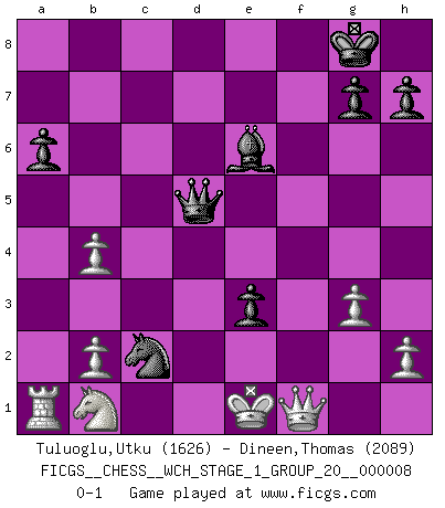 Last move : 0-1 2010 July 10 14:22:14 [Event "FICGS__CHESS__WCH_STAGE_1_GROUP_20__000008"] [Site "FICGS"] [Date "2010.07.02"] [Round "1"] [White "Tuluoglu,Utku"] [Black "Dineen,Thomas"] [Result "0-1"] [WhiteElo "1626"] [BlackElo "2089"] 1.e4 c5 2.Nf3 Nc6 3.d4 cxd4 4.Nxd4 Nf6 5.Nc3 d6 6.Be2 e5 7.Ndb5 a6 8.Na3 b5 9.Nd5 Nxe4 10.Bf3 f5 11.Nc3 Be6 12.Nxe4 fxe4 13.Bxe4 d5 14.Bf3 b4 15.Nb1 Bc5 16.Be3 Bxe3 17.fxe3 Qg5 18.Qd2 e4 19.Be2 O-O 20.g3 d4 21.exd4 e3 22.Qd3 Qd5 23.Rf1 Rxf1+ 24.Bxf1 Nxd4 25.a3 Rf8 26.axb4 Rxf1+ 27.Qxf1 Nxc2+ 0-1 Sicilian : Boleslavsky variation Kingside Castling by player Black (move 19) Player Black won this chess game. Follow this game move after move (download)I don't believe in psychology. I believe in good moves. (Bobby Fischer) Immer nach dem besten Zug zu suchen ist ziemlich unpraktisch. (Nigel Short) El Ajedrez, como cualquier actividad creativa, solo puede existir a través del esfuerzo combinado de aquellos que tienen talento creativo y de aquellos que poseen la habilidad de organizar su trabajo creativo. (Mikhail Botvinnik) Le profane ne songe pas à la somme de jouissance dont il se prive, qui méconnaît ce jeu aux ressources aussi variées que passionnantes. (Jean-Marie Jeanton-Lamarche) We need strong personalities and only one world champion to attract sponsors. (Anatoly Karpov)