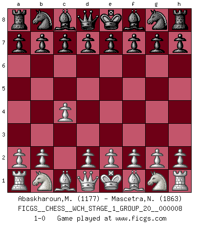 Last move : 1-0 2010 October 8 9:27:12 [Event "FICGS__CHESS__WCH_STAGE_1_GROUP_20__000008"] [Site "FICGS"] [Date "2010.08.13"] [Round "1"] [White "Abaskharoun,Mena"] [Black "Mascetra,Nicola"] [Result "1-0"] [WhiteElo "1177"] [BlackElo "1863"] 1.c4 1-0 This chess game has been lost on time (started : 2010.08.13 14:17:38) English Opening Player White won this chess game. Follow this game move after move (download)The game of chess is the touchstone of the intellect. (Goethe) Ich verlor meine Bürgerrechte, mein Gehalt wurde mir nicht mehr bezahlt und ich wurde zensiert und durfte nicht mehr ins Ausland reisen. [nach dem Match Fischer-Taimanov 6:0] (Mark Taimanov) El Ajedrez es un juego terrible. Si no dominas el centro, tu oponente tiene una posición mas libre. Si tu tienes el centro, entonces realmente tienes algo de que preocuparte. (Siegbert Tarrasch) Je menace de comprendre la position. (Anonyme) Only sick music makes money today. (Friedrich Nietzsche)