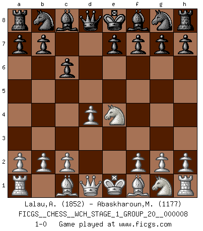 Last move : 1-0 2010 October 7 21:27:41 [Event "FICGS__CHESS__WCH_STAGE_1_GROUP_20__000008"] [Site "FICGS"] [Date "2010.08.13"] [Round "1"] [White "Lalau,Alexandre"] [Black "Abaskharoun,Mena"] [Result "1-0"] [WhiteElo "1852"] [BlackElo "1177"] 1.e4 c6 2.d4 d5 3.Nd2 dxe4 4.Nxe4 1-0 This chess game has been lost on time (started : 2010.08.13 14:17:38) Caro-Kann : 3.Nd2 Player White won this chess game. Follow this game move after move (download)Chess is a fairy tale of 1001 blunders. (Savielly Tartakower) Wenn sie aufgeben, dann danke ich Ihnen für das Spiel (Eventualzug beim Fernschach). (Anonymous) Bobby solo arroja las piezas y solas caen en las casillas correctas. (Miguel Najdorf ) Les erreurs sont comme les malheurs, elles n'arrivent jamais seules. (Siegbert Tarrasch) The bottom line is always the bottom line. (Johann Piek)