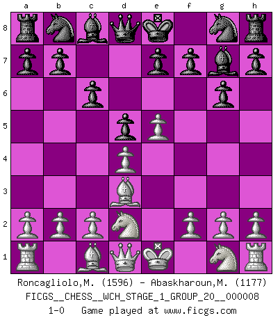 Last move : 1-0 2010 October 9 9:31:15 [Event "FICGS__CHESS__WCH_STAGE_1_GROUP_20__000008"] [Site "FICGS"] [Date "2010.08.13"] [Round "1"] [White "Roncagliolo,Marco"] [Black "Abaskharoun,Mena"] [Result "1-0"] [WhiteElo "1596"] [BlackElo "1177"] 1.e4 c6 2.d4 d5 3.Nd2 g6 4.e5 Bg7 5.Bd3 1-0 This chess game has been lost on time (started : 2010.08.13 14:17:38) Caro-Kann : 3.Nd2 Player White won this chess game. Follow this game move after move (download)Play the opening like a book, the middle game like a magician, and the endgame like a machine. (Spielmann) Karpov ist ein Museumsstück. (Garry Kasparov) Desconfianza es la característica mas necesaria de un jugador de Ajedrez. (Siegbert Tarrasch) Il a essayé de se convaincre qu'il pourrait empêcher toutes les erreurs et ne jamais perdre. L'horreur ! Gary Kasparov au sujet de Robert Fischer. When you have everything, sometimes it feels like nothing. (Horatio Caine, C.S.I. Miami)