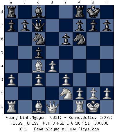 Last move : 0-1 2010 August 23 10:44:13 [Event "FICGS__CHESS__WCH_STAGE_1_GROUP_21__000008"] [Site "FICGS"] [Date "2010.07.02"] [Round "1"] [White "Vuong Linh,Nguyen"] [Black "Kuhne,Detlev"] [Result "0-1"] [WhiteElo "0831"] [BlackElo "2079"] 1.d4 Nf6 2.c4 e6 3.Nc3 Bb4 4.e3 O-O 5.Bd3 d5 6.Nge2 c5 7.O-O Nc6 8.a3 dxc4 9.Bxc4 Bxc3 10.bxc3 Qc7 0-1 This chess game has been lost on time (started : 2010.07.02 1:12:43) Nimzo-Indian : 4.e3 O-O, 5.Bd3 d5 Kingside Castling by player Black (move 4) Kingside Castling by player White (move 7) Player Black won this chess game. Follow this game move after move (download)In Fischer's hands, a slight theoretical advantage is as good a being a Queen ahead. (Isaac Kashdan) Der Umstand, daß uns eine 7 Stunden Zeitkontrolle ermöglicht eine großartige, tiefe Partie zu spielen, ist für die Massenmedien nicht weiter von Bedeutung. (Alexej Shirov) Al jugar al Ajedrez entonces, podemos aprender: Primero: Previsión... Segundo: Prudencia... Tercero: Cautela... Y al final, aprendemos del Ajedrez el hábito de no ser desanimados por apariencias malas presentes en el estado de nuestros asuntos, el hábito de la esperanza por una oportunidad favorable y la perseveración de los secretos de los recursos. (Benjamin Franklin) Il vaut toujours mieux jouer un plan faux de façon logique que de n'avoir pas de plan du tout. (Victor Kortchnoï) The real danger is not that computers will begin to think like men, but that men will begin to think like computers. (Sydney J. Harris)