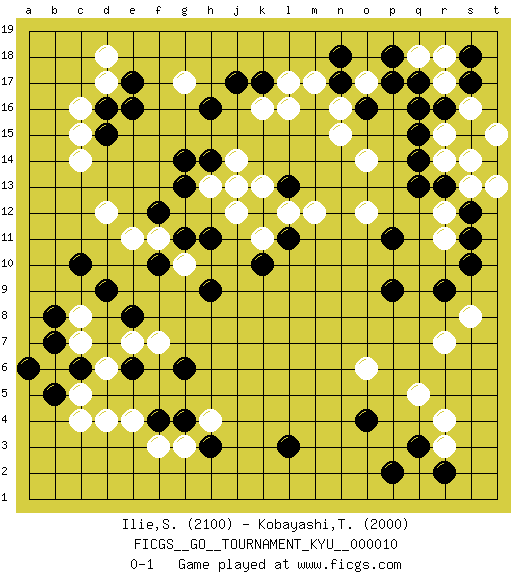 Last move : 0-1 2007 April 11 22:44:12 [Event "FICGS__GO__TOURNAMENT_KYU__000010"] [Site "FICGS"] [Date "2006.11.11"] [Round "1"] [Black "Ilie,Sebastian"] [White "Kobayashi,Tetsuya"] [Result "0-1"] [Rating 1 "2100"] [Rating 2 "2000"] 1.q16 d4 2.q3 d17 3.r9 q5 4.o4 r3 5.r2 r4 6.p2 r7 7.p9 o6 8.l3 o17 9.q14 k16 10.c10 c14 11.c6 f3 12.h3 c4 13.e6 c8 14.d9 b6 15.b7 c7 16.b5 d6 17.a6 c5 18.b8 e7 19.e8 f7 20.h16 j14 21.k17 l17 22.j17 l16 23.h14 h13 24.g14 g17 25.g13 j13 26.d15 c15 27.d16 c16 28.e17 d18 29.e16 e11 30.f10 f11 31.g11 g10 32.f12 d12 33.h11 r17 34.q17 q18 35.p18 r18 36.p17 s14 37.s15 r15 38.r16 s16 39.s17 t15 40.s18 r11 41.s10 s8 42.r13 s13 43.s12 r12 44.s11 r14 45.q13 t13 46.l13 k11 47.h9 o14 48.q15 o12 49.p11 m12 50.k12 j12 51.l11 l12 52.k10 k13 53.o16 n16 54.n17 m17 55.n18 n15 56.g6 h4 57.g4 g3 58.f4 e4 0-1 This go game has been lost on time (started : 2006.11.11 14:23:0) Here are the names of the openings (joseki) played in the four corners : Corner q16 : q16 o17 Hoshi (Hwajeom, Seongjeom, Xingwei`) 4-4 Point. The star or hoshi (4-4) point, emphasizing influence at the potential expense of territory. Ikken Kakari (Hankan Keolch'im, Yi Gua`jiao~, 1-Space Low Approach). White 2 is the standard approach move to the 4-4. Corner d4 : d4 c6 Hoshi (Hwajeom, Seongjeom, Xingwei`) 4-4 Point. The star or hoshi (4-4) point, emphasizing influence at the potential expense of territory. Ikken Kakari (Hankan Keolch'im, Yi Gua`jiao~, 1-Space Low Approach). Black 2 is the standard approach move to the 4-4. Player White won this Go (weiqi, baduk) game. Follow this game move after move (download)One big eye kills one small eye. (Anonymous) Life is pleasant. Death is peaceful. It's the transition that's troublesome. (Isaac Asimov)