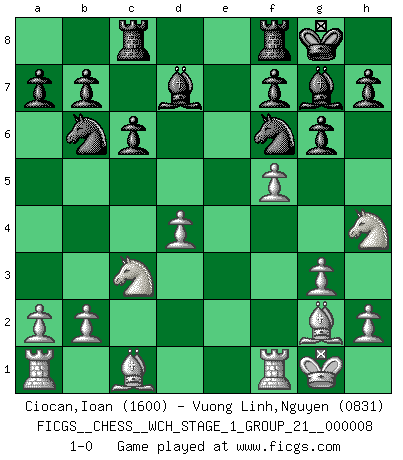 Last move : 1-0 2010 August 18 10:44:24 [Event "FICGS__CHESS__WCH_STAGE_1_GROUP_21__000008"] [Site "FICGS"] [Date "2010.07.02"] [Round "1"] [White "Ciocan,Ioan"] [Black "Vuong Linh,Nguyen"] [Result "1-0"] [WhiteElo "1600"] [BlackElo "0831"] 1.d4 Nf6 2.c4 g6 3.Nc3 d5 4.Nf3 Bg7 5.Qb3 dxc4 6.Qxc4 O-O 7.g3 Bf5 8.Bg2 c6 9.O-O Nbd7 10.Qb3 Qb6 11.Qxb6 Nxb6 12.Nh4 Bd7 13.e4 Rac8 14.f4 e6 15.f5 exf5 16.exf5 1-0 This chess game has been lost on time (started : 2010.07.02 1:12:43) King's Indian defense, 3.Nc3 Kingside Castling by player Black (move 6) Kingside Castling by player White (move 9) Player White won this chess game. Follow this game move after move (download)A bad day of Chess is better than any good day at work. (Anonymous) Wenn ein Kopf und ein Buch zusammenstoßen und es klingt hohl, ist es denn allemal im Buche? (Georg Christoph Lichtenberg) Prefiero perder una partida realmente buena, que ganar una mala. (David Levy) Karpov est une pièce de musée. (Garry Kasparov) The human is the only animal species whose members are able to talk themselves into difficulties that would not otherwise exist. (Wendell Johnson)