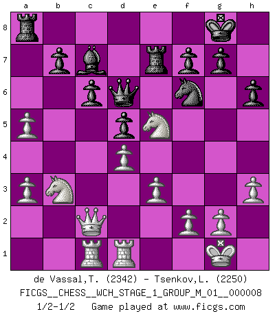 Last move : 1/2-1/2 2010 July 24 15:13:2 [Event "FICGS__CHESS__WCH_STAGE_1_GROUP_M_01__000008"] [Site "FICGS"] [Date "2010.07.02"] [Round "1"] [White "de Vassal,Thibault"] [Black "Tsenkov,Ljubomir"] [Result "1/2-1/2"] [WhiteElo "2342"] [BlackElo "2250"] 1.d4 d5 2.c4 e6 3.Nc3 Nf6 4.cxd5 exd5 5.Bg5 Be7 6.e3 c6 7.Bd3 Bg4 8.Qc2 Bh5 9.Bxf6 Bxf6 10.Nh3 Bg6 11.Nf4 Bxd3 12.Nxd3 Nd7 13.O-O O-O 14.Rac1 a6 15.Qb3 Rb8 16.Rfd1 Re8 17.Qc2 a5 18.Na4 Be7 19.Nac5 Nf6 20.a3 Bd6 21.b4 h6 22.h3 Re7 23.Nb3 Bc7 24.bxa5 Qd6 25.Ne5 Ra8 1/2-1/2 QGD : Exchange, positional line Kingside Castling by player White (move 13) Kingside Castling by player Black (move 13) This chess game ended in a draw. Follow this game move after move (download)Fischer sacrificed virtually everything most of us weakies (to use his term) value, respect, and cherish, for the sake of an artful, often beautiful board game, for the ambivalent privilege of being its greatest master. (Paul Kollar) Es ist im Leben wie im Schachspiel. Wir entwerfen einen Plan, dieser bleibt jedoch bedingt durch das, was im Schachspiel dem Gegner, im Leben dem Schicksal zu tun belieben wird. (Arthur Schopenhauer) La táctica fluye a partir de una posición superior. (Bobby Fischer) Tous ces prétendus hommes politiques sont les pions, les Cavaliers, les Tours ou les Fous d'une partie d'échecs qui se jouera tant qu'un hasard ne renversera pas l'échiquier. (Honoré de Balzac) A belief is an idea the mind possesses, an idea that possesses the mind. (Robert Oxden Bolton)