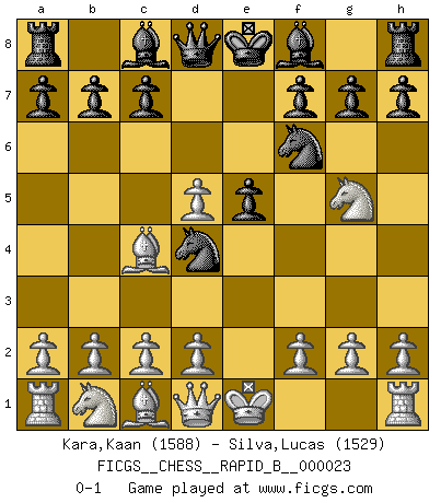 Last move : 0-1 2006 December 26 2:17:52 [Event "FICGS__CHESS__RAPID_B__000023"] [Site "FICGS"] [Date "2006.11.11"] [Round "1"] [White "Kara,Kaan"] [Black "Silva,Lucas"] [Result "0-1"] [WhiteElo "1588"] [BlackElo "1529"] 1.e4 e5 2.Nf3 Nc6 3.Bc4 Nf6 4.Ng5 d5 5.exd5 Nd4 0-1 This chess game has been lost on time (started : 2006.11.11 17:11:25) Two knights defense : Fritz variation Player Black won this chess game. Follow this game move after move (download)Let the perfectionist play postal. (Yasser Seirawan) Wenn Capablanka heute auf der Schachbühne erscheinen würde, hätte er ein halbes Jahr gebraucht um sich die Schachtheorie anzueignen. Und dann hätte er alles und jeden besiegt. (Mikhail Moiseyevich Botvinik) El Ajedrez es parte de la cultura, y si una cultura esta en decadencia, entonces también el Ajedrez declinará. (Mikhail Botvinnik) On est toujours la mazette de quelqu'un d'autre. (Anonyme) There's always a bigger fish. (Qui-Gon Jinn in Star Wars ep.1)