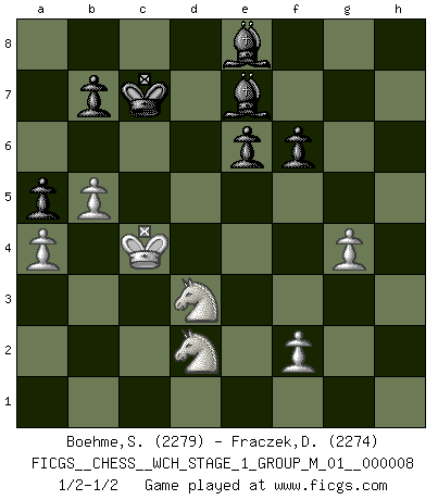 Last move : 1/2-1/2 2010 December 22 18:41:17 [Event "FICGS__CHESS__WCH_STAGE_1_GROUP_M_01__000008"] [Site "FICGS"] [Date "2010.07.02"] [Round "1"] [White "Boehme,Sebastian"] [Black "Fraczek,Dariusz"] [Result "1/2-1/2"] [WhiteElo "2279"] [BlackElo "2274"] 1.e4 e6 2.d4 d5 3.Nc3 Nf6 4.Bg5 Bb4 5.e5 h6 6.exf6 hxg5 7.fxg7 Rg8 8.h4 gxh4 9.Nf3 Qf6 10.Qd3 Bd7 11.Qh7 Qxg7 12.Qxg7 Rxg7 13.Rxh4 Nc6 14.g3 O-O-O 15.Kd2 a6 16.Re1 Ne7 17.a3 Bd6 18.Ne2 c5 19.c3 Rdg8 20.dxc5 Bxc5 21.Ned4 Rg6 22.b4 Bb6 23.Rf4 R6g7 24.Ne5 Be8 25.Bd3 Rh8 26.b5 a5 27.a4 Bc7 28.Ndf3 Bd6 29.Kc2 Kb8 30.c4 Bb4 31.Rf1 Ka7 32.Kb2 Bd6 33.Kb3 dxc4+ 34.Bxc4 Nc8 35.Rd1 Rh5 36.Re4 Be7 37.Nd3 Nb6 38.Nd2 R7g5 39.Ra1 Rh8 40.Rc1 Rgh5 41.Nf3 Rh1 42.Rxh1 Rxh1 43.Re1 Rxe1 44.Nfxe1 Kb8 45.Nf3 Nxc4 46.Kxc4 f6 47.g4 Kc7 48.Nd2 1/2-1/2 Comment by player 1 : Sebastian Boehme : Thanks for the game! My opening play was totally bad this time and I should normally have lost it somewhere in the middle. But with the queen and rooks exchanged I felt more comfortable again. French seems still playable after all. Regards, Sebastian French : MacCutcheon, Chigorin variation Queenside Castling by player Black (move 14) This chess game ended in a draw. Follow this game move after move (download)Fischer, who may or may not be mad as a hatter, has every right to be horrified. (Jeremy Silman) Ich liebe den Moment, wenn ich das Ego meines Gegenüber breche. (Robert James Fischer) En el tablero, la mentira e hipocresía no sobreviven mucho. (Emanuel Lasker) Les échecs, c'est l'imagination. (David Bronstein) Don't be irreplaceable, if you can't be replaced, you can't be promoted. (Dan Rotaru)