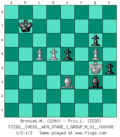 Last move : 1/2-1/2 2010 October 12 14:27:55 [Event "FICGS__CHESS__WCH_STAGE_1_GROUP_M_01__000008"] [Site "FICGS"] [Date "2010.07.02"] [Round "1"] [White "Broniek,Mariusz Maciej"] [Black "Fric,Lubos"] [Result "1/2-1/2"] [WhiteElo "2240"] [BlackElo "2235"] 1.e4 c5 2.Nf3 e6 3.d4 cxd4 4.Nxd4 Nf6 5.Nc3 d6 6.g4 h6 7.h4 e5 8.Bb5+ Bd7 9.Bxd7+ Qxd7 10.Nf5 Nc6 11.f3 O-O-O 12.Ne3 Ne7 13.Ned5 Nfxd5 14.Nxd5 Qc6 15.Be3 Nxd5 16.Qxd5 Qxd5 17.exd5 a6 18.Kd2 Be7 19.Kd3 h5 20.g5 Kd7 21.c3 Rc8 22.Rhg1 b5 23.a4 Rb8 24.f4 bxa4 25.fxe5 dxe5 26.Rgf1 f6 27.Rxa4 Rxb2 28.Rxa6 Rc8 29.Ra7+ Rc7 30.Rxc7+ Kxc7 31.Ra1 fxg5 32.Ra7+ Rb7 33.Rxb7+ Kxb7 34.hxg5 h4 35.Ke4 g6 36.Kf3 Ba3 37.c4 Bb4 38.c5 Be1 39.Kg4 Bg3 1/2-1/2 Sicilian : Anderssen variation Queenside Castling by player Black (move 11) 10 pieces endgame at move 34 : White KBPPP , Black KBPPP WHITE : King + 1 Bishop 3 Pawns BLACK : King + 1 Bishop 3 Pawns This chess game ended in a draw. Follow this game move after move (download)Chess is no whit inferior to the violin, and we have a large number of professional violinists. (Mikhail Botvinnik) Im Schach nämlich geht es darum, daß Ich des Gegners klein zu kriegen, sein Ego zu zerbrechen und zu zermahlen, seine Selbstachtung zu zertreten und zu verscharren und seine ganze mißachtenswerte sogenannte Persönlichkeit ein für alle Mal tot zu hacken und zu zerstampfen und dadurch die menschliche Gesellschaft von einer stinkenden Pestbeule zu befreien. Es ist ein königliches Spiel. (Robert James Fischer) Siempre es mucho mejor sacrificar las piezas de tu oponente. (Savielly Tartakover) On peut tirer plus d'utilité d'une partie perdue que de 100 parties gagnées. (Capablanca) Creativity involves breaking out of established patterns in order to look at things in a different way. (Edward De Bono)