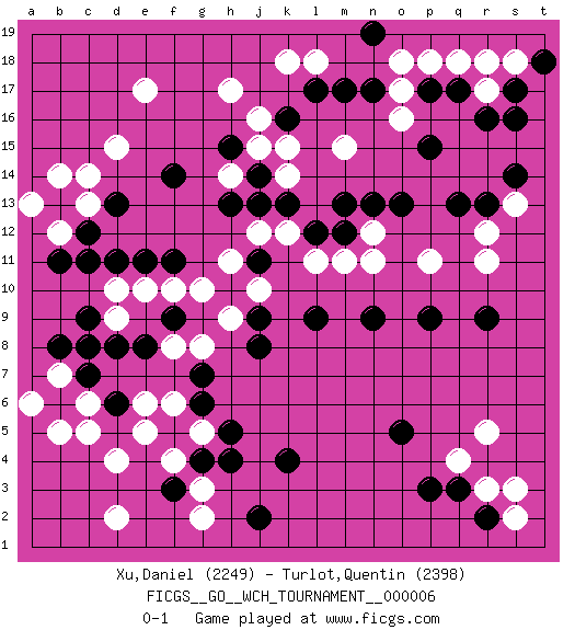 Last move : 0-1 2010 September 11 14:47:14 [Event "FICGS__GO__WCH_TOURNAMENT__000006"] [Site "FICGS"] [Date "2010.07.02"] [Round "1"] [Black "Xu,Daniel"] [White "Turlot,Quentin"] [Result "0-1"] [Rating 1 "2249"] [Rating 2 "2398"] 1.r16 d4 2.q3 d15 3.k16 h17 4.h15 k18 5.l17 l18 6.m17 e17 7.k4 r11 8.r13 r5 9.r9 s13 10.s14 r12 11.q13 r3 12.r2 q4 13.p3 s3 14.p9 p11 15.o13 n11 16.n9 l11 17.m12 n12 18.n13 m11 19.o5 s2 20.f3 c6 21.j11 j12 22.l9 h11 23.j9 j10 24.c11 c13 25.c8 d2 26.f5 e6 27.g7 h9 28.j8 d9 29.c9 f6 30.g6 d10 31.b6 b7 32.c7 b5 33.d6 c5 34.b8 a6 35.e8 e5 36.d8 f8 37.f9 g8 38.d11 e10 39.e11 f10 40.f11 g10 41.f14 j15 42.b13 b12 43.c12 b14 44.d13 c14 45.b11 a13 46.j14 h14 47.h13 k14 48.j13 k15 49.k13 j16 50.l12 k12 51.m13 f4 52.g4 g5 53.h5 g3 54.h4 g2 55.j2 o17 56.n17 o18 57.n19 r17 58.s17 s18 59.q17 r18 60.s16 q18 61.p17 p18 62.t18 o16 63.p15 m15 0-1 Here are the names of the openings (joseki) played in the four corners : Corner q4 : q3 r5 Komoku (Somok, Xiao~mu`) 3-4 Point. The komoku (3-4) point is the traditional corner enclosure move.. Ikken Kakari (Hankan Keolch'im, Yi Gua`jiao~, 1-Space Low Pincer). The small knight move is the basic approach move to the 3-4 point stone. It has been continually used for over four centuries. There are limitless variations, with new moves constantly being discovered. White 2 opens the door to a treaure store of joseki. Corner d4 : d4 f3 Hoshi (Hwajeom, Seongjeom, Xingwei`) 4-4 Point. The star or hoshi (4-4) point, emphasizing influence at the potential expense of territory. Ikken Kakari (Hankan Keolch'im, Yi Gua`jiao~, 1-Space Low Approach). Black 2 is the standard approach move to the 4-4. Player White won this Go (weiqi, baduk) game. Follow this game move after move (download)The weak player fears ko, the strong player seeks it. (Bill Taylor) Vladimir Ras-Putin is still alive... He is also a good actor, I saw him in the Lord of the Rings. (Rodolfo d'Ettorre)