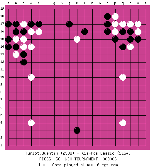 Last move : 1-0 2010 September 8 11:27:33 [Event "FICGS__GO__WCH_TOURNAMENT__000006"] [Site "FICGS"] [Date "2010.07.02"] [Round "1"] [Black "Turlot,Quentin"] [White "Kis-Kos,Laszlo"] [Result "1-0"] [Rating 1 "2398"] [Rating 2 "2154"] 1.q16 d4 2.c16 q4 3.j17 d10 4.c12 r14 5.o16 q10 6.k3 k15 7.l16 r17 8.r16 s16 9.s15 s17 10.r15 p18 11.o18 p17 12.o17 p16 13.p15 q17 14.q14 e16 15.e17 d16 16.d17 c15 17.b16 d14 18.b14 b13 19.c13 b15 20.a15 c14 21.a14 c17 22.b17 a16 23.a17 1-0 This go game has been lost on time (started : 2010.07.02 1:42:9) Here are the names of the openings (joseki) played in the four corners : Corner q16 : q16 r14 Hoshi (Hwajeom, Seongjeom, Xingwei`) 4-4 Point. The star or hoshi (4-4) point, emphasizing influence at the potential expense of territory. Ikken Kakari (Hankan Keolch'im, Yi Gua`jiao~, 1-Space Low Approach). White 2 is the standard approach move to the 4-4. Player Black won this Go (weiqi, baduk) game. Follow this game move after move (download)To reduce an opponent's large prospective territory, strike at the shoulder. (Anonymous) In theory there is no difference between theory and practice. In practice there is. (Yogi Berra)
