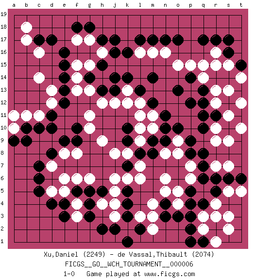 Last move : 1-0 2010 December 17 18:23:10 [Event "FICGS__GO__WCH_TOURNAMENT__000006"] [Site "FICGS"] [Date "2010.07.02"] [Round "1"] [Black "Xu,Daniel"] [White "de Vassal,Thibault"] [Result "1-0"] [Rating 1 "2249"] [Rating 2 "2074"] 1.q17 q3 2.d4 c16 3.e16 h16 4.e14 c14 5.c17 b17 6.d17 b18 7.k16 h14 8.k14 g13 9.e12 g11 10.d10 d13 11.e13 f15 12.e15 q15 13.q13 o15 14.o17 p13 15.q12 q14 16.p12 r13 17.o13 r16 18.r17 r12 19.p14 p15 20.r11 s11 21.s10 r10 22.q11 s9 23.q10 r9 24.s12 t10 25.r14 s13 26.s14 t12 27.s16 s15 28.t15 r15 29.p8 j12 30.k3 f3 31.e3 f4 32.c6 f6 33.n3 f8 34.d8 j6 35.k10 h9 36.r5 q5 37.q6 r4 38.p5 s5 39.q4 r3 40.p3 l6 41.j17 l12 42.h17 m10 43.m8 l9 44.l8 k8 45.k7 l7 46.g5 h4 47.f5 e5 48.e4 e6 49.k5 k6 50.h5 j5 51.g4 j3 52.g3 n16 53.n17 m16 54.m17 c11 55.c10 b11 56.b10 a10 57.a9 a11 58.b9 k2 59.s6 t5 60.k9 j8 61.m9 l10 62.n10 g17 63.g18 f17 64.d11 d12 65.f10 g10 66.f9 m4 67.n4 m3 68.t6 s3 69.p2 q2 70.s17 t14 71.j13 k13 72.l13 k12 73.j14 d5 74.c5 g6 75.h2 n6 76.h13 h12 77.g14 f14 78.h15 f13 79.m12 m11 80.n11 l11 81.m14 g15 82.l2 l3 83.k4 j4 84.j2 m2 85.k1 n5 86.q1 r1 87.p1 s2 88.j16 r7 89.r6 s7 90.f18 l16 91.l17 o4 92.o3 o5 93.p4 d7 94.c7 e8 95.e9 n8 96.n9 o8 97.p9 p7 98.q7 p6 99.q8 o9 100.o10 1-0 Here are the names of the openings (joseki) played in the four corners : Corner d16 : c16 e16 Komoku (Somok, Xiao~mu`) 3-4 Point. The komoku (3-4) point is the traditional corner enclosure move.. Ikken Takagakari (Hankan Nop'dakeolch'im, Yi Gaogua`jiao~, 1-Space High Approach). The 5-4 approach move has become more popular in modern times, as modern Go emphasizes speed and influence. Corner q16 : q17 q15 Komoku (Somok, Xiao~mu`) 3-4 Point. The komoku (3-4) point is the traditional corner enclosure move.. Ikken Takagakari (Hankan Nop'dakeolch'im, Yi Gaogua`jiao~, 1-Space High Approach). The 5-4 approach move has become more popular in modern times, as modern Go emphasizes speed and influence. Corner d4 : d4 f3 Hoshi (Hwajeom, Seongjeom, Xingwei`) 4-4 Point. The star or hoshi (4-4) point, emphasizing influence at the potential expense of territory. Ikken Kakari (Hankan Keolch'im, Yi Gua`jiao~, 1-Space Low Approach). White 2 is the standard approach move to the 4-4. Player Black won this Go (weiqi, baduk) game. Follow this game move after move (download)Against three in a row, play right in the center. (Anonymous) Have no fear of perfection - you'll never reach it. (Salvador Dali)
