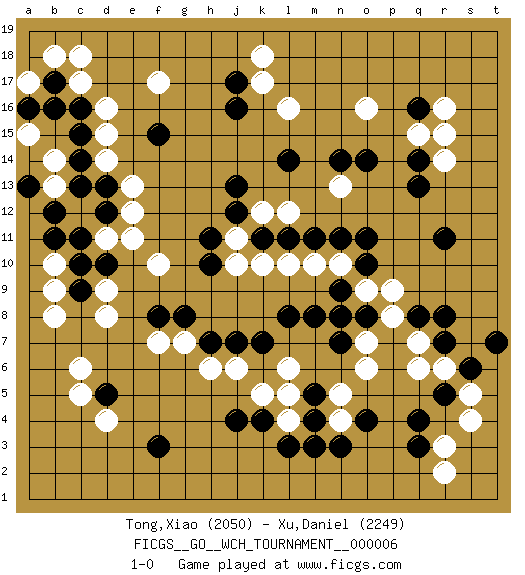 Last move : 1-0 2010 August 6 13:3:56 [Event "FICGS__GO__WCH_TOURNAMENT__000006 "] [Site "FICGS"] [Date "2010.07.02"] [Round "1"] [Black "Tong,Xiao "] [White "Xu,Daniel "] [Result "1-0"] [Rating 1 "2050"] [Rating 2 "2249"] 1.q16 d4 2.q4 d16 3.f3 c6 4.k4 r6 5.o4 s4 6.r7 q7 7.r8 q6 8.q8 r3 9.q3 r2 10.s6 s5 11.t7 o6 12.o8 n4 13.n3 n5 14.m3 l6 15.l8 l4 16.l3 k5 17.m4 l5 18.j4 o16 19.q14 l16 20.j17 k17 21.j16 f17 22.f15 d14 23.l14 k18 24.o14 n13 25.n14 l12 26.j12 j11 27.k11 k12 28.j13 k10 29.l11 l10 30.m11 m10 31.n11 n10 32.h11 j10 33.o11 n8 34.n7 o7 35.n9 p8 36.m8 p9 37.o10 o9 38.k7 n8 39.d5 c5 40.o8 r15 41.n8 r14 42.r11 q15 43.r5 h6 44.h7 j6 45.j7 g7 46.g8 f7 47.m5 r16 48.q13 f10 49.h10 e12 50.f8 d9 51.c15 d15 52.c16 c17 53.b17 b18 54.c9 d8 55.b16 c18 56.b12 b13 57.c13 b14 58.c14 b10 59.c10 b9 60.b11 b8 61.d12 d11 62.d13 e13 63.c11 a17 64.d10 e11 65.a13 a15 66.a16 1-0 Here are the names of the openings (joseki) played in the four corners : Corner d4 : d4 f3Hoshi (Hwajeom, Seongjeom, Xingwei`) 4-4 Point. The star or hoshi (4-4) point, emphasizing influence at the potential expense of territory.Ikken Kakari (Hankan Keolch'im, Yi Gua`jiao~, 1-Space Low Approach). Black 2 is the standard approach move to the 4-4. Corner q4 : q4 r6Hoshi (Hwajeom, Seongjeom, Xingwei`) 4-4 Point. The star or hoshi (4-4) point, emphasizing influence at the potential expense of territory.Ikken Kakari (Hankan Keolch'im, Yi Gua`jiao~, 1-Space Low Approach). White 2 is the standard approach move to the 4-4. Corner q16 : q16 o16Hoshi (Hwajeom, Seongjeom, Xingwei`) 4-4 Point. The star or hoshi (4-4) point, emphasizing influence at the potential expense of territory.Ikken Takagakari (Hankan Nop'dakeolch'im, Yi Gaojia, 1-Space High Approach). Black typically responds at 6-4 or 3-10. Black 4-10 is played when Black finds play on the right side advantageous. Black 4-8 or 3-8 may be played when Black has support at top. Corner d16 : d16 j17Hoshi (Hwajeom, Seongjeom, Xingwei`) 4-4 Point. The star or hoshi (4-4) point, emphasizing influence at the potential expense of territory. Player Black won this Go (weiqi, baduk) game.Follow this game move after move (download ) Only amateurs try to come up with fancy moves. (Anonymous) Life is the sum of all your choices. (Albert Camus)