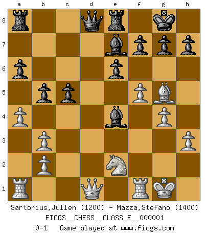 Last move : 0-1 2006 August 11 17:21:28 [Event "FICGS__CHESS__CLASS_F__000001"] [Site "FICGS"] [Date "2006.04.28"] [Round "1"] [White "Sartorius,Julien"] [Black "Mazza,Stefano"] [Result "0-1"] [WhiteElo "1200"] [BlackElo "1400"] 1.e4 c5 2.Nc3 e6 3.Bc4 d6 4.d3 Nf6 5.Nge2 Nc6 6.Bg5 Be7 7.f4 O-O 8.O-O a6 9.h3 b5 10.Bb3 Bb7 11.g3 Re8 12.g4 Nd4 13.a4 Nxb3 14.cxb3 d5 15.f5 dxe4 16.dxe4 Nxe4 17.Nxe4 Bxe4 0-1 Sicilian : Closed Kingside Castling by player Black (move 7) Kingside Castling by player White (move 8) Player Black won this chess game. Follow this game move after move (download)All my games are real. (Bobby Fischer) Heutzutage gewinnt im Turnier nicht derjenige Spieler, der weitreichende Pläne entwirft, sondern einfach jener, der Zug um Zug kämpft. (David Bronstein) La última cosa en que Fischer estaba interesado era en tonterías, siempre y cuando el Ajedrez estuviera involucrado. (Elie Agur) Les échecs, c'est l'art d'analyser. (Mikhail Botvinnik) As the days dwindle down... to a precious few. (Maxwell Anderson)