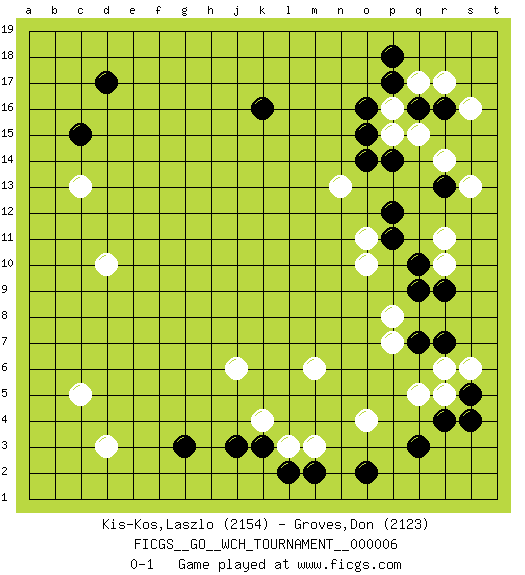 Last move : 0-1 2010 September 11 20:41:21 [Event "FICGS__GO__WCH_TOURNAMENT__000006"] [Site "FICGS"] [Date "2010.07.02"] [Round "1"] [Black "Kis-Kos,Laszlo"] [White "Groves,Don"] [Result "0-1"] [Rating 1 "2154"] [Rating 2 "2123"] 1.r16 q5 2.d17 c5 3.c15 r14 4.p17 r11 5.k3 m3 6.g3 d3 7.q3 o4 8.r4 r5 9.s5 s6 10.s4 p8 11.k16 d10 12.q10 r10 13.q9 o10 14.p11 o11 15.p12 n13 16.p14 q15 17.o15 p16 18.o16 q17 19.q16 p15 20.o14 r17 21.r13 s16 22.r9 c13 23.p18 s13 24.r7 r6 25.q7 p7 26.o2 m6 27.m2 l3 28.l2 k4 29.j3 j6 0-1 This go game has been lost on time (started : 2010.07.02 1:42:9) Here are the names of the openings (joseki) played in the four corners : Corner q16 : r16 r14 Komoku (Somok, Xiao~mu`) 3-4 Point. The komoku (3-4) point is the traditional corner enclosure move.. Corner d4 : c5 g3 Mokuhazushi (Waemok, Wai`mu`) 5-3 Point. The mokuhazushi (5-3) point was popular in the Edo period in Japan (1600 - 1867). It emphasizes influence; territorially, it is inferior to the 3-4 point. Player White won this Go (weiqi, baduk) game. Follow this game move after move (download)In the corner, five stones in a row on the third line are alive. (Anonymous) Home computers are being called upon to perform many new functions, including the consumption of homework formerly eaten by the dog. (Doug Larson)