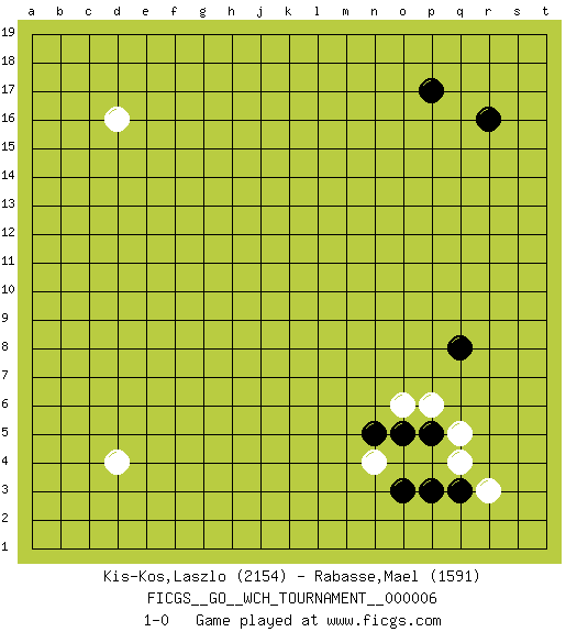 Last move : 1-0 2010 August 19 10:44:10 [Event "FICGS__GO__WCH_TOURNAMENT__000006"] [Site "FICGS"] [Date "2010.07.02"] [Round "1"] [Black "Kis-Kos,Laszlo"] [White "Rabasse,Mael"] [Result "1-0"] [Rating 1 "2154"] [Rating 2 "1591"] 1.r16 d16 2.q3 d4 3.p17 q5 4.q8 n4 5.p5 p6 6.o5 q4 7.o3 r3 8.p3 o6 9.n5 1-0 This go game has been lost on time (started : 2010.07.02 1:42:9) Here are the names of the openings (joseki) played in the four corners : Corner q4 : q3 q5 Komoku (Somok, Xiao~mu`) 3-4 Point. The komoku (3-4) point is the traditional corner enclosure move.. Ikken Takagakari (Hankan Nop'dakeolch'im, Yi Gaogua`jiao~, 1-Space High Approach). The 5-4 approach move has become more popular in modern times, as modern Go emphasizes speed and influence. Player Black won this Go (weiqi, baduk) game. Follow this game move after move (download)Don't make dango's. (Anonymous) The various flowers seem good to different people. (Chinese proverb)