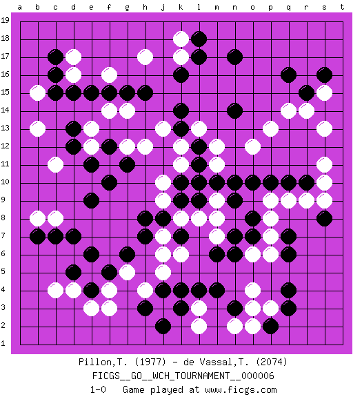 Last move : 1-0 2010 November 27 13:40:31 [Event "FICGS__GO__WCH_TOURNAMENT__000006"] [Site "FICGS"] [Date "2010.07.02"] [Round "1"] [Black "Pillon,Thibault"] [White "de Vassal,Thibault"] [Result "1-0"] [Rating 1 "1977"] [Rating 2 "2074"] 1.q16 c4 2.q4 d17 3.e4 h4 4.d7 e5 5.f5 d4 6.e6 e3 7.d5 f3 8.d15 c11 9.c17 d16 10.c16 f16 11.e15 h17 12.e11 c8 13.c7 b8 14.b7 b13 15.r10 b15 16.c15 o4 17.q6 l3 18.n17 r14 19.r15 q14 20.n14 p13 21.o10 o12 22.k16 m12 23.h15 k17 24.l17 k18 25.l18 k12 26.p2 p3 27.q3 o2 28.k4 s15 29.s16 s13 30.k3 l2 31.j2 o6 32.n3 o3 33.m4 n2 34.l4 p7 35.q7 p9 36.p10 q9 37.q10 m7 38.k7 r9 39.m10 l10 40.l9 m9 41.n9 m8 42.o8 p8 43.o7 p6 44.n6 s10 45.m6 l8 46.k9 k8 47.j8 j9 48.k10 j7 49.h8 j10 50.l11 k11 51.l10 k6 52.n7 j5 53.l12 l13 54.k13 j13 55.k14 m11 56.n10 s11 57.s8 s9 58.e9 j3 59.j4 g5 60.h7 j6 61.h3 f4 62.g6 e13 63.d13 e12 64.d12 f14 65.f15 g14 66.g15 f11 67.f10 h12 68.g11 g12 69.f12 1-0 Here are the names of the openings (joseki) played in the four corners : Corner d4 : c4 e4 Komoku (Somok, Xiao~mu`) 3-4 Point. The komoku (3-4) point is the traditional corner enclosure move.. Ikken Takagakari (Hankan Nop'dakeolch'im, Yi Gaogua`jiao~, 1-Space High Approach). The 5-4 approach move has become more popular in modern times, as modern Go emphasizes speed and influence. Corner d16 : d17 d15 Komoku (Somok, Xiao~mu`) 3-4 Point. The komoku (3-4) point is the traditional corner enclosure move.. Ikken Takagakari (Hankan Nop'dakeolch'im, Yi Gaogua`jiao~, 1-Space High Approach). The 5-4 approach move has become more popular in modern times, as modern Go emphasizes speed and influence. Corner q4 : q4 o4 Hoshi (Hwajeom, Seongjeom, Xingwei`) 4-4 Point. The star or hoshi (4-4) point, emphasizing influence at the potential expense of territory. Ikken Takagakari (Hankan Nop'dakeolch'im, Yi Gaojia, 1-Space High Approach). Black typically responds at 6-4 or 3-10. Black 4-10 is played when Black finds play on the right side advantageous. Black 4-8 or 3-8 may be played when Black has support at top. Player Black won this Go (weiqi, baduk) game. Follow this game move after move (download)Fighting must not be the key to go, it should be reserved as your last resource. (Zhong-Pu Liu, about Weiqi) Always remember that you are unique; just like everyone else. (Unknown)