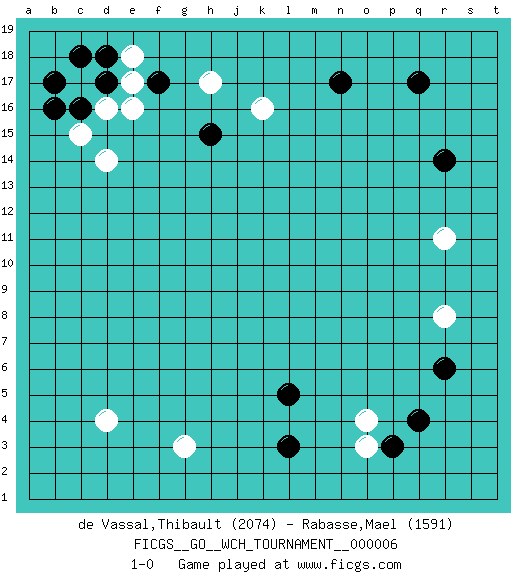 Last move : 1-0 2010 August 27 22:50:2 [Event "FICGS__GO__WCH_TOURNAMENT__000006"] [Site "FICGS"] [Date "2010.07.02"] [Round "1"] [Black "de Vassal,Thibault"] [White "Rabasse,Mael"] [Result "1-0"] [Rating 1 "2074"] [Rating 2 "1591"] 1.q4 d4 2.q17 d16 3.f17 h17 4.d17 c17 5.c16 e17 6.d18 e16 7.b17 c15 8.b16 e18 9.c18 d14 10.h15 k16 11.n17 r11 12.r14 r8 13.r6 o3 14.p3 o4 15.l3 g3 16.l5 1-0 This go game has been lost on time (started : 2010.07.02 1:42:9) Here are the names of the openings (joseki) played in the four corners : Corner d16 : d16 f17 Hoshi (Hwajeom, Seongjeom, Xingwei`) 4-4 Point. The star or hoshi (4-4) point, emphasizing influence at the potential expense of territory. Ikken Kakari (Hankan Keolch'im, Yi Gua`jiao~, 1-Space Low Approach). Black 2 is the standard approach move to the 4-4. Corner q4 : q4 r8 Hoshi (Hwajeom, Seongjeom, Xingwei`) 4-4 Point. The star or hoshi (4-4) point, emphasizing influence at the potential expense of territory. Player Black won this Go (weiqi, baduk) game. Follow this game move after move (download)Don't make dango's. (Anonymous) Memory is a way of holding onto the things you love, the things you are, the things you never want to lose. (from the television show: The Wonder Years)