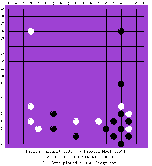 Last move : 1-0 2010 August 21 22:42:29 [Event "FICGS__GO__WCH_TOURNAMENT__000006"] [Site "FICGS"] [Date "2010.07.02"] [Round "1"] [Black "Pillon,Thibault"] [White "Rabasse,Mael"] [Result "1-0"] [Rating 1 "1977"] [Rating 2 "1591"] 1.q16 d16 2.q3 d4 3.q9 n4 4.q5 k4 5.g3 e3 6.g5 d6 7.k2 q2 8.r2 p3 9.p2 q4 10.q1 r3 11.p4 q2 12.o3 r5 13.q3 q6 14.r4 1-0 This go game has been lost on time (started : 2010.07.02 1:42:9) Here are the names of the openings (joseki) played in the four corners : Corner d4 : d4 g3 Hoshi (Hwajeom, Seongjeom, Xingwei`) 4-4 Point. The star or hoshi (4-4) point, emphasizing influence at the potential expense of territory. Niken Kakari (Dukan Keolch'im, E`r Gua`jiao~, 2-Space Low Approach). White typically answers by 7-3 or 3-5 (which is not joseki). Player Black won this Go (weiqi, baduk) game. Follow this game move after move (download)For rectangular six in the corner, dame is necessary. (Anonymous) Information on the Internet is subject to the same rules and regulations as conversation at a bar. (George Lundberg)