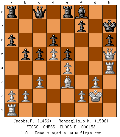 Last move : 1-0 2010 July 21 23:47:1 [Event "FICGS__CHESS__CLASS_D__000153"] [Site "FICGS"] [Date "2010.07.02"] [Round "1"] [White "Jacobs,Francois"] [Black "Roncagliolo,Marco"] [Result "1-0"] [WhiteElo "1456"] [BlackElo "1596"] 1.e4 e5 2.Nf3 Nc6 3.Bb5 a6 4.Ba4 Nf6 5.O-O Be7 6.Re1 b5 7.Bb3 d6 8.c3 O-O 9.h3 Nb8 10.d4 Nbd7 11.Nbd2 c5 12.Nf1 Qc7 13.Ng3 Re8 14.d5 Bf8 15.Bc2 g6 16.Be3 Bg7 17.Qe2 Rf8 18.Nh2 Re8 19.Nf3 Nf8 20.Nh2 h6 21.Qd1 Kh7 22.Bd3 Bd7 23.Be2 g5 24.Ng4 Nxg4 25.Bxg4 Ng6 26.Nf5 Nf4 27.g3 Ng6 28.Kg2 Bf8 29.Rh1 Kg8 30.h4 gxh4 31.Nxh4 Nxh4+ 32.Rxh4 Kh7 33.Qf3 Bxg4 34.Qxg4 Qc8 35.Qh5 1-0 Ruy Lopez : Closed Kingside Castling by player White (move 5) Kingside Castling by player Black (move 8) Player White won this chess game. Follow this game move after move (download)Checkers is for tramps. (Paul Morphy) Als er Schachweltmeister wurde ließ er praktisch alle stärksten Sovietspieler für sich arbeiten. Wenn ein auch nur mittelmässiger Meister ein Spezialist für eine bestimmte Eröffnung war, wurde er von Karpov gerufen. Das wurde alles geheim gehalten. (Mikhail Moiseyevich Botvinik) El Ajedrez es un cuento de Hadas de las 1001 metidas de pata. (Savielly Tartakower) La solitude du joueur d'Echecs à l'approche du mat est semblable à celle du condamné. (Francis Szpiner) Experiences are the keys to life. (Daniel Parmet)
