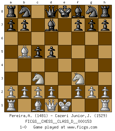 Last move : 1-0 2010 August 26 22:51:5 [Event "FICGS__CHESS__CLASS_D__000153"] [Site "FICGS"] [Date "2010.07.02"] [Round "1"] [White "Pereira,Antonio"] [Black "Cazeri Junior,Jose Roque"] [Result "1-0"] [WhiteElo "1481"] [BlackElo "1529"] 1.e4 c5 2.Bc4 e6 3.Nf3 d5 4.exd5 exd5 5.Bb5+ Bd7 6.Nc3 1-0 This chess game has been lost on time (started : 2010.07.02 11:58:7) Sicilian defense Player White won this chess game. Follow this game move after move (download)It's always better to sacrifice your opponent's men. (Savielly Tartakover) Wenn Capablanka heute auf der Schachbühne erscheinen würde, hätte er ein halbes Jahr gebraucht um sich die Schachtheorie anzueignen. Und dann hätte er alles und jeden besiegt. (Mikhail Moiseyevich Botvinik) El jugador táctico debe saber que hacer cuando algo se debe de hacer. El estratégico debe saber que hacer cuando nada se debe de hacer. (Savielly Tartakover) Je ne crois pas en la psychologie, je crois aux bons coups. (Robert Fischer) We need strong personalities and only one world champion to attract sponsors. (Anatoly Karpov)