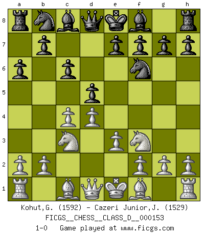 Last move : 1-0 2010 September 4 23:8:28 [Event "FICGS__CHESS__CLASS_D__000153"] [Site "FICGS"] [Date "2010.07.02"] [Round "1"] [White "Kohut,Gregory"] [Black "Cazeri Junior,Jose Roque"] [Result "1-0"] [WhiteElo "1592"] [BlackElo "1529"] 1.d4 d5 2.c4 c6 3.Nf3 Nf6 4.Nc3 a6 5.e3 1-0 This chess game has been lost on time (started : 2010.07.02 11:58:7) QGD Slav : 4.Nc3 Player White won this chess game. Follow this game move after move (download)Dazzling combinations are for the many, shifting wood is for the few. (Georg Kieninger) Ich tröste mich mit dem Vergnügen, daß Schachfans, Zuschauer und Leser glücklich sind, wenn ein Großmeister etwas riskiert, statt nur Klötzchen zu schieben. (Mikhail Nekhemyevich Tal) Aquel que ve no otra dirección en el juego que la de dar Jaque Mate a su oponente, nunca será un buen jugador de Ajedrez. (Euwe) Le plus grand jeu de l'esprit jamais inventé, plus vous l'apprenez, plus vous y prenez du plaisir. (Garry Kasparov) Life is like internet, nothing interesting, but noone want to leave it. (Ilmars Cirulis)