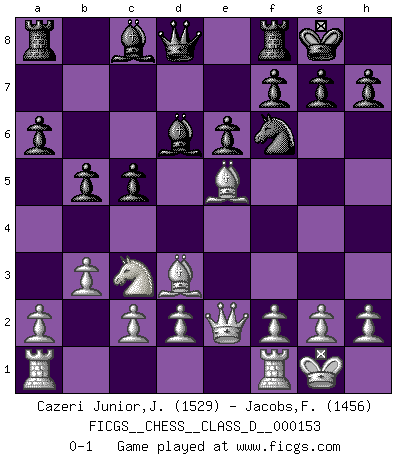 Last move : 0-1 2010 September 24 21:5:9 [Event "FICGS__CHESS__CLASS_D__000153"] [Site "FICGS"] [Date "2010.07.02"] [Round "1"] [White "Cazeri Junior,Jose Roque"] [Black "Jacobs,Francois"] [Result "0-1"] [WhiteElo "1529"] [BlackElo "1456"] 1.e4 c5 2.Nf3 e6 3.b3 a6 4.Bb2 Nc6 5.Bd3 d6 6.O-O Nf6 7.e5 dxe5 8.Nxe5 Nxe5 9.Bxe5 Bd6 10.Qe2 O-O 11.Nc3 b5 0-1 This chess game has been lost on time (started : 2010.07.02 11:58:7) Sicilian defense Kingside Castling by player White (move 6) Kingside Castling by player Black (move 10) Player Black won this chess game. Follow this game move after move (download)A chess genius has died; a loss for humanity. (Viktor Kortchnoi, about Bobby Fischer's death) Die Elozahlen sind sehr schlecht für das Schach. Jetzt ist Schach eine Sportindustrie, die darauf zielt Elopunkte zu machen. (Miguel Najdorf) En la perfecta combinación de Ajedrez como en una historia corta de primera clase, toda la trama y contra trama deberá conducir hacia un final sorprendente, el interes no es mitigado hasta el último momento. (Yates and Winter) L'attaque fait le spectacle, la défense gagne les matchs. (Dicton footballistique) Luck never gives; it only lends. (Swedish proverb)